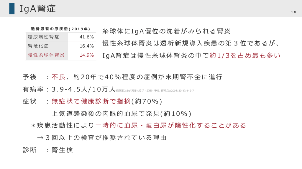 #18. Ig A 腎 症 18 透析患者の原疾患(2019年) ⽷球体にIgA優位の沈着がみられる腎炎 糖尿病性腎症 41.6% 腎硬化症 16.4% 慢性⽷球体腎炎は透析新規導⼊疾患の第3位であるが、 慢性⽷球体腎炎 14.9% IgA腎症は慢性⽷球体腎炎の中で約1/3を占め最も多い 予後 ︓不良、約20年で40%程度の症例が末期腎不全に進⾏ 有病率︓3.9-4.5⼈/10万⼈ *遠藤正之:IgA腎症の疫学・症候・予後. ⽇腎会誌2008;50(4):442-7. 症状 ︓無症状で健康診断で指摘(約70%) 上気道感染後の⾁眼的⾎尿で発⾒(約10%) *疾患活動性により⼀時的に⾎尿・蛋⽩尿が陰性化することがある →3回以上の検査が推奨されている理由 診断 ︓腎⽣検