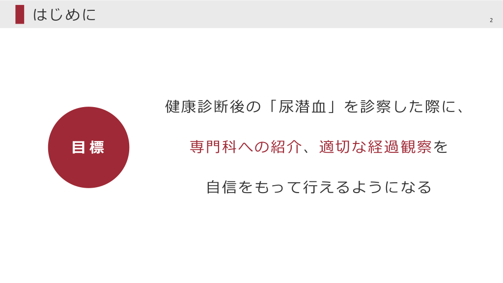 #2. はじめに 2 健康診断後の「尿潜⾎」を診察した際に、 ⽬標 専⾨科への紹介、適切な経過観察を ⾃信をもって⾏えるようになる