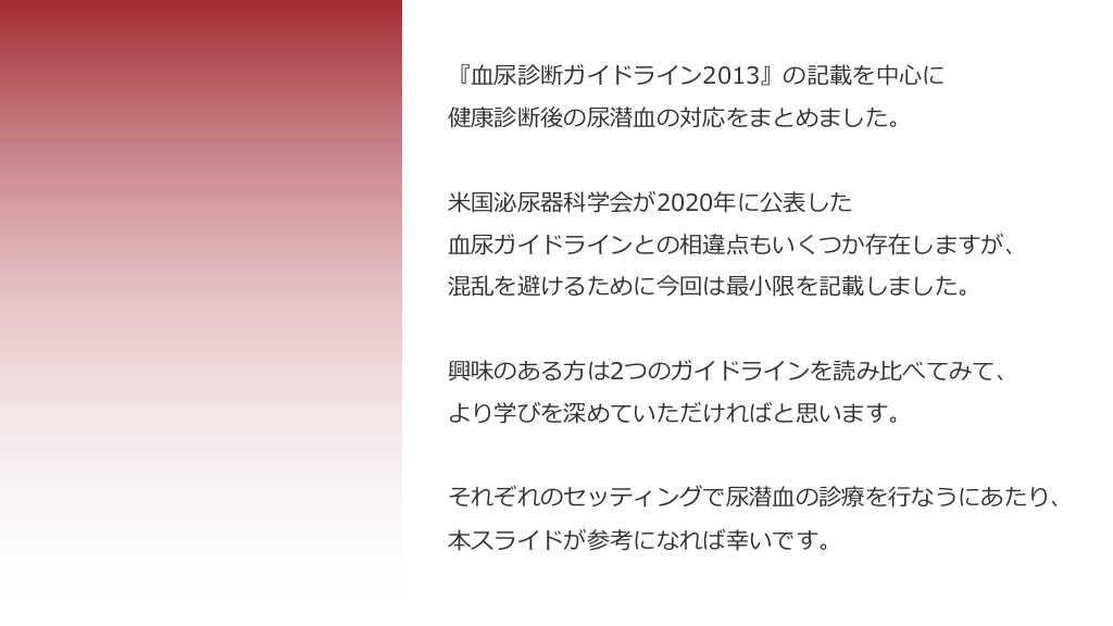 #20. 『⾎尿診断ガイドライン2013』の記載を中⼼に 健康診断後の尿潜⾎の対応をまとめました。 ⽶国泌尿器科学会が2020年に公表した ⾎尿ガイドラインとの相違点もいくつか存在しますが、 混乱を避けるために今回は最⼩限を記載しました。 興味のある⽅は2つのガイドラインを読み⽐べてみて、 より学びを深めていただければと思います。 それぞれのセッティングで尿潜⾎の診療を⾏なうにあたり、 本スライドが参考になれば幸いです。