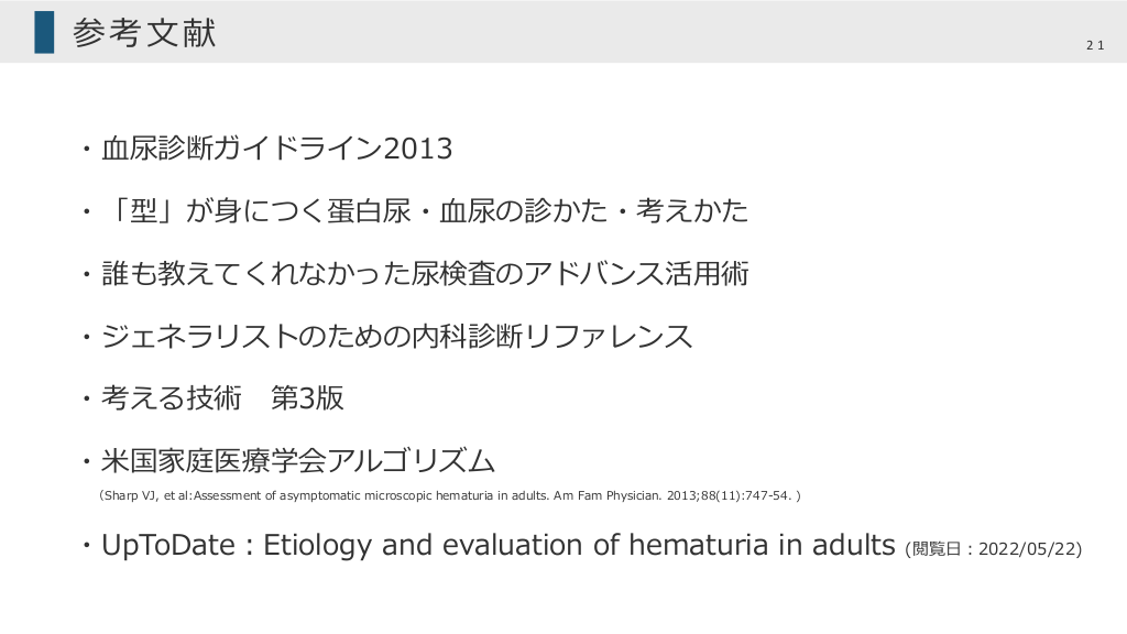 #21. 参考⽂献 21 ・⾎尿診断ガイドライン2013 ・「型」が⾝につく蛋⽩尿・⾎尿の診かた・考えかた ・誰も教えてくれなかった尿検査のアドバンス活⽤術 ・ジェネラリストのための内科診断リファレンス ・考える技術 第3版 ・⽶国家庭医療学会アルゴリズム (Sharp VJ, et al:Assessment of asymptomatic microscopic hematuria in adults. Am Fam Physician. 2013;88(11):747-54. ) ・UpToDate︓Etiology and evaluation of hematuria in adults (閲覧⽇︓2022/05/22)