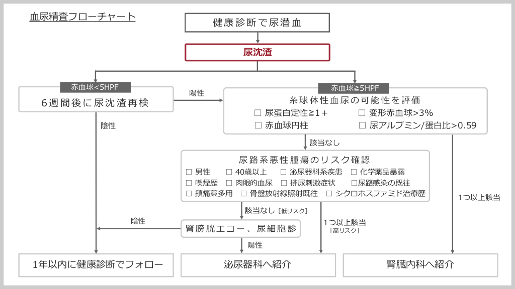 #13. ⾎尿精査フローチャート 健康診断で尿潜⾎ 尿沈渣 ⾚⾎球<5HPF 6週間後に尿沈渣再検 陽性 ⾚⾎球≧5HPF ⽷球体性⾎尿の可能性を評価 □ 尿蛋⽩定性≧1+ □ 変形⾚⾎球>3% □ ⾚⾎球円柱 陰性 □ 尿アルブミン/蛋⽩⽐>0.59 該当なし 尿路系悪性腫瘍のリスク確認 □ 男性 □ 40歳以上 □ 泌尿器科系疾患 □ 化学薬品暴露 □ 喫煙歴 □ ⾁眼的⾎尿 □ 排尿刺激症状 □尿路感染の既往 □ 鎮痛薬多⽤ □ ⾻盤放射線照射既往 □ シクロホスファミド治療歴 陰性 該当なし[低リスク] 腎膀胱エコー、尿細胞診 1つ以上該当 [⾼リスク] 陽性 1年以内に健康診断でフォロー 泌尿器科へ紹介 腎臓内科へ紹介 1つ以上該当