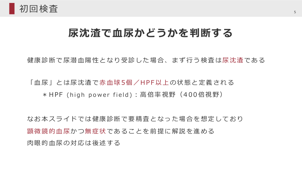 #5. 初回検査 5 尿沈渣で⾎尿かどうかを判断する 健康診断で尿潜⾎陽性となり受診した場合、まず⾏う検査は尿沈渣である 「⾎尿」とは尿沈渣で⾚⾎球5個/HPF以上の状態と定義される *HPF (high power field)︓⾼倍率視野(400倍視野) なお本スライドでは健康診断で要精査となった場合を想定しており 顕微鏡的⾎尿かつ無症状であることを前提に解説を進める ⾁眼的⾎尿の対応は後述する