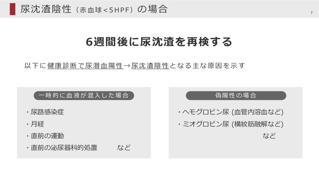 #7. 尿沈渣陰性(⾚⾎球<5HPF)の場合 7 6週間後に尿沈渣を再検する 以下に健康診断で尿潜⾎陽性→尿沈渣陰性となる主な原因を⽰す ⼀時的に⾎液が混⼊した場合 偽陽性の場合 ・尿路感染症 ・ヘモグロビン尿 (⾎管内溶⾎など) ・⽉経 ・ミオグロビン尿 (横紋筋融解など) ・直前の運動 ・直前の泌尿器科的処置 など など