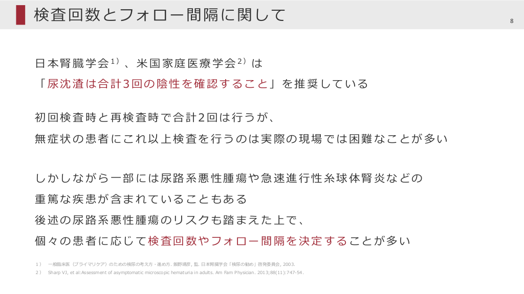 #8. 検査回数とフォロー間隔に関して ⽇ 本 腎 臓 学 会 1)、 ⽶ 国 家 庭 医 療 学 会 2)は 「尿沈渣は合計3回の陰性を確認すること」を推奨している 初回検査時と再検査時で合計2回は⾏うが、 無症状の患者にこれ以上検査を⾏うのは実際の現場では困難なことが多い しかしながら⼀部には尿路系悪性腫瘍や急速進⾏性⽷球体腎炎などの 重篤な疾患が含まれていることもある 後述の尿路系悪性腫瘍のリスクも踏まえた上で、 個々の患者に応じて検査回数やフォロー間隔を決定することが多い 1) ⼀般臨床医(プライマリケア)のための検尿の考え⽅・進め⽅. 飯野靖彦, 監. ⽇本腎臓学会「検尿の勧め」啓発委員会, 2003. 2) Sharp VJ, et al:Assessment of asymptomatic microscopic hematuria in adults. Am Fam Physician. 2013;88(11):747-54. 8