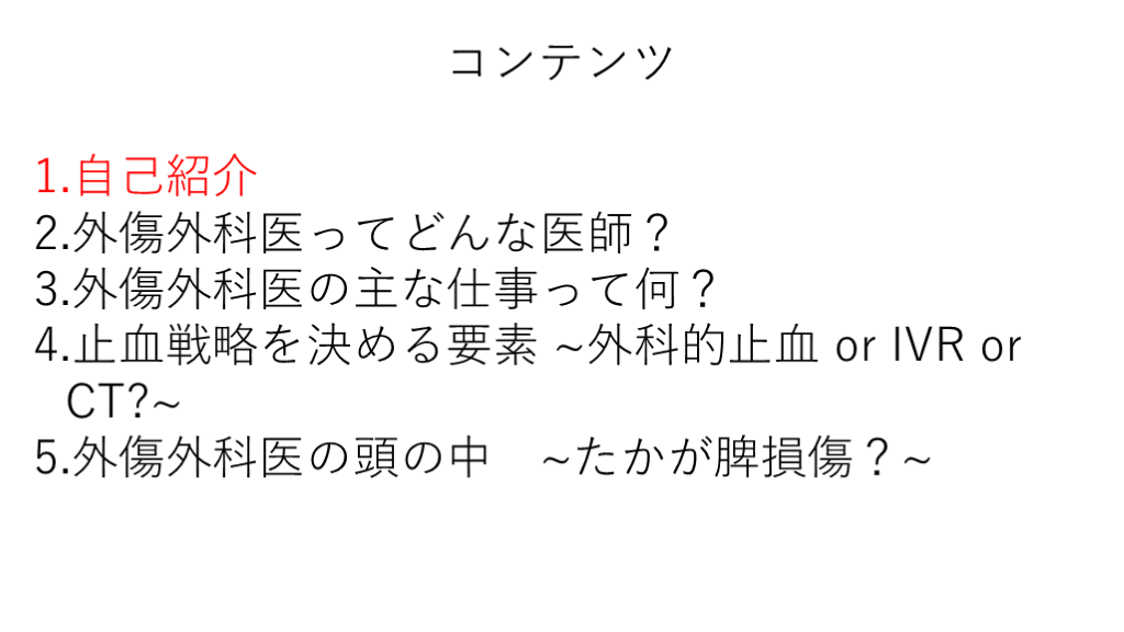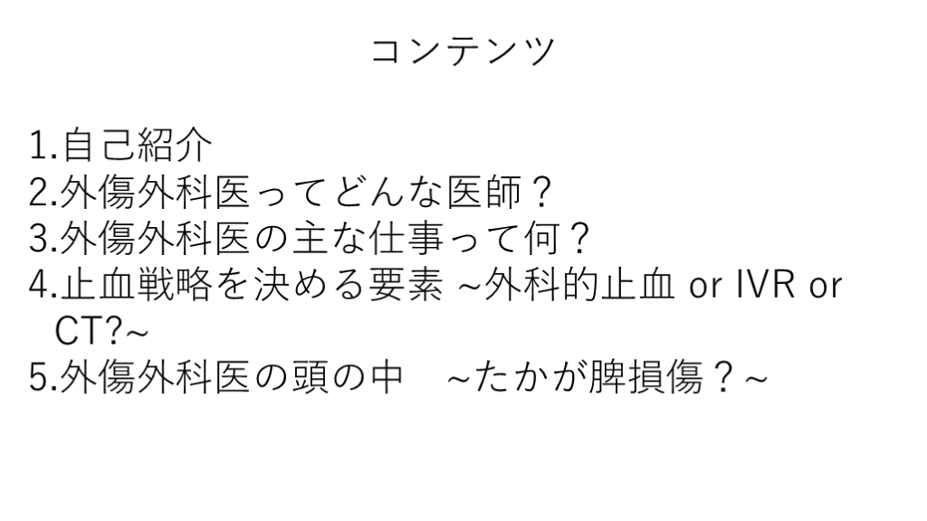 羊土社から「ERからはじまる外傷の治療戦略」というテキストを出版しています。スライドのケースよりも、少し考えることの多いケースを14例取り上げ、止血戦略だけでなく、各臓器損傷に対する治療のガイドラインも解説しています。ご興味がありましたら、立ち読みや購買のほど、よろしくお願いします。
