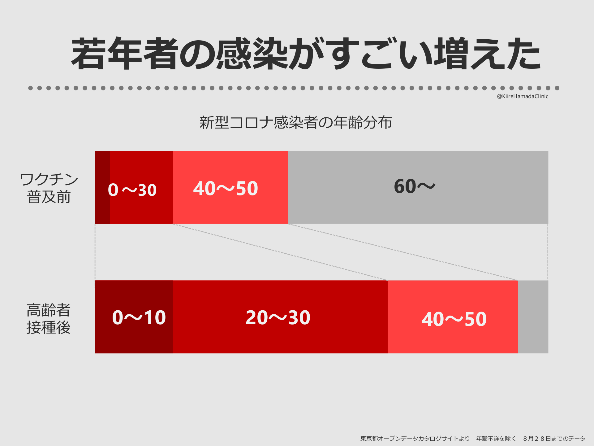 #15. 若年者の感染がすごい増えた @KiireHamadaClinic 新型コロナ感染者の年齢分布 ワクチン 普及前 ⾼齢者 接種後 0〜30 0〜10 40〜50 20〜30 60〜 40〜50 東京都オープンデータカタログサイトより 年齢不詳を除く 8⽉28⽇までのデータ