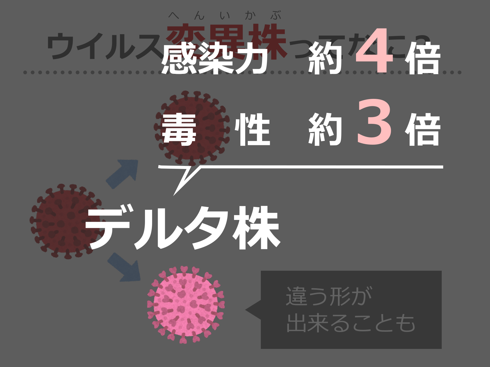 #20. へ ん い か ぶ 4 約3倍 ウイルス感染⼒ 変異株ってなに︖ 約 倍 毒 性 デルタ株 違う形が 出来ることも