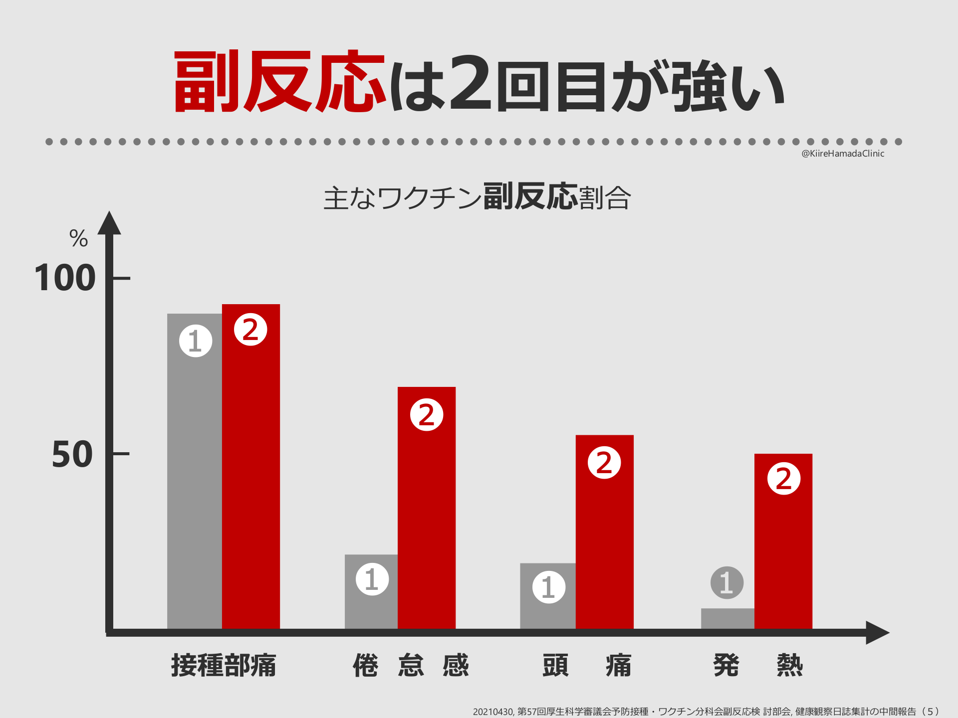 #22. 副反応は2回⽬が強い @KiireHamadaClinic 主なワクチン副反応割合 % 100 ❶ ❷ ❷ 50 ❶ 接種部痛 倦 怠 感 ❷ ❶ ❶ 頭 ❷ 痛 発 熱 20210430, 第57回厚⽣科学審議会予防接種・ワクチン分科会副反応検 討部会, 健康観察⽇誌集計の中間報告(5)