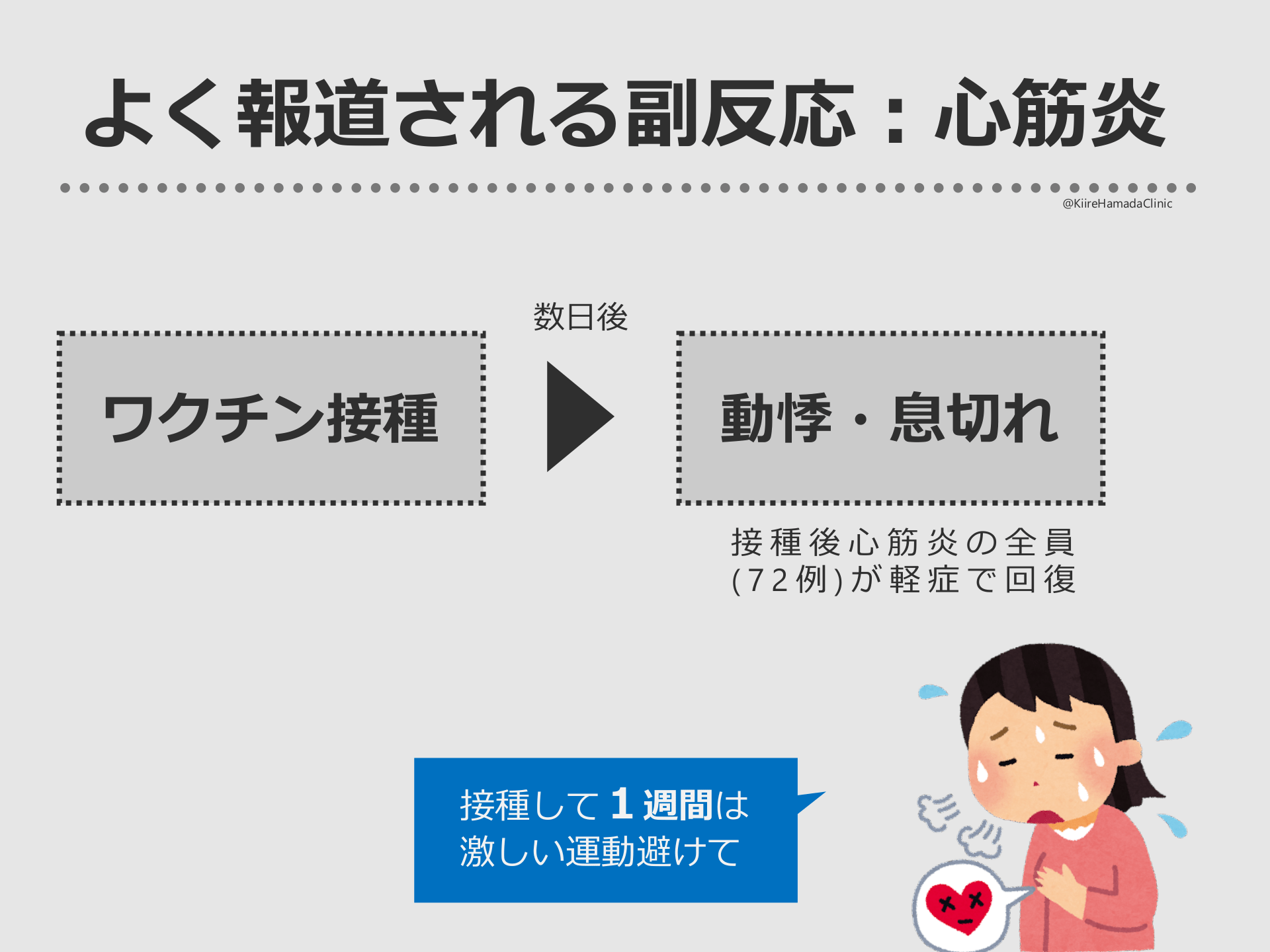 #23. よく報道される副反応︓⼼筋炎 @KiireHamadaClinic 数⽇後 ワクチン接種 動悸・息切れ 接種後⼼筋炎の全員 (72例)が軽症で回復 接種して1週間は 激しい運動避けて