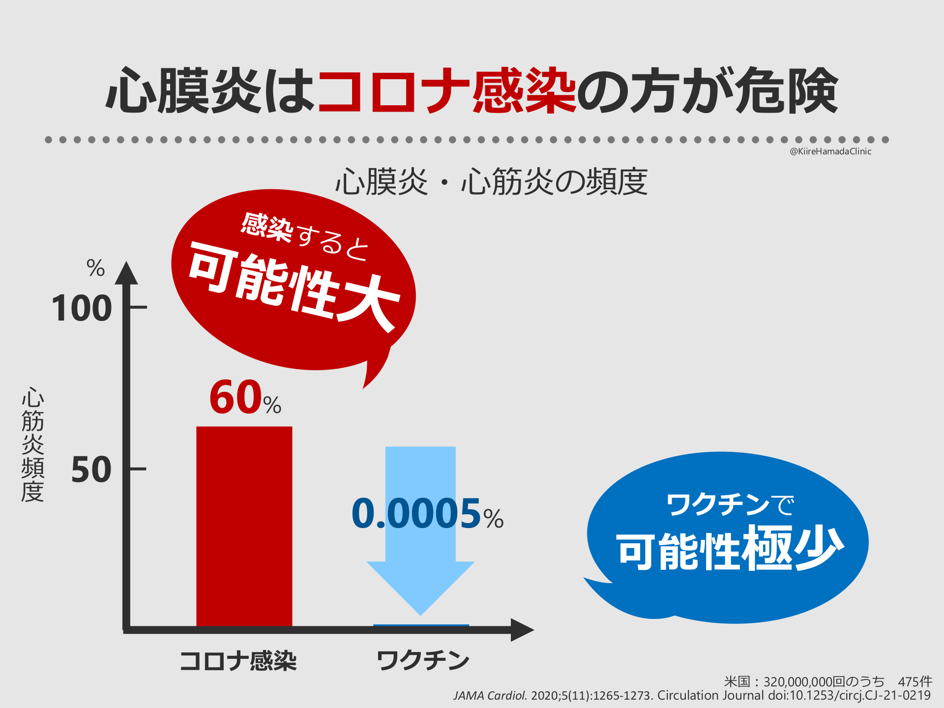 #24. ⼼膜炎はコロナ感染の⽅が危険 @KiireHamadaClinic % 100 ⼼ 筋 炎 頻 度 感染 す ⼼膜炎・⼼筋炎の頻度 ると 可能性 ⼤ 60% 50 0.0005% コロナ感染 ワクチン ワクチンで 可能性極少 ⽶国︓320,000,000回のうち 475件 JAMA Cardiol. 2020;5(11):1265-1273. Circulation Journal doi:10.1253/circj.CJ-21-0219