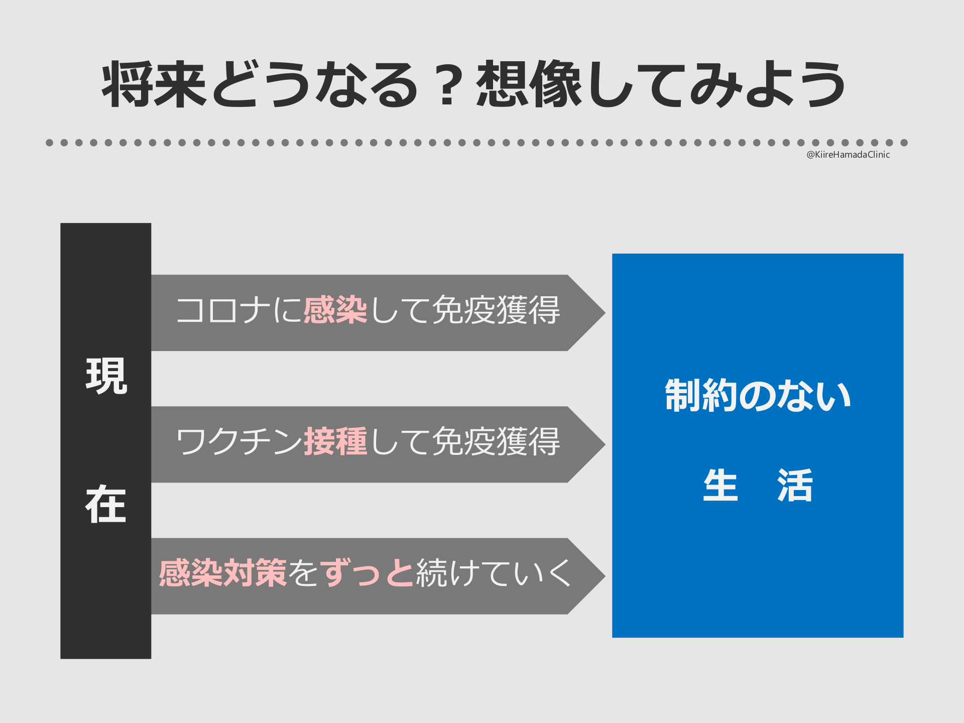 #28. 将来どうなる︖想像してみよう @KiireHamadaClinic コロナに感染して免疫獲得 現 ワクチン接種して免疫獲得 在 感染対策をずっと続けていく 制約のない ⽣ 活
