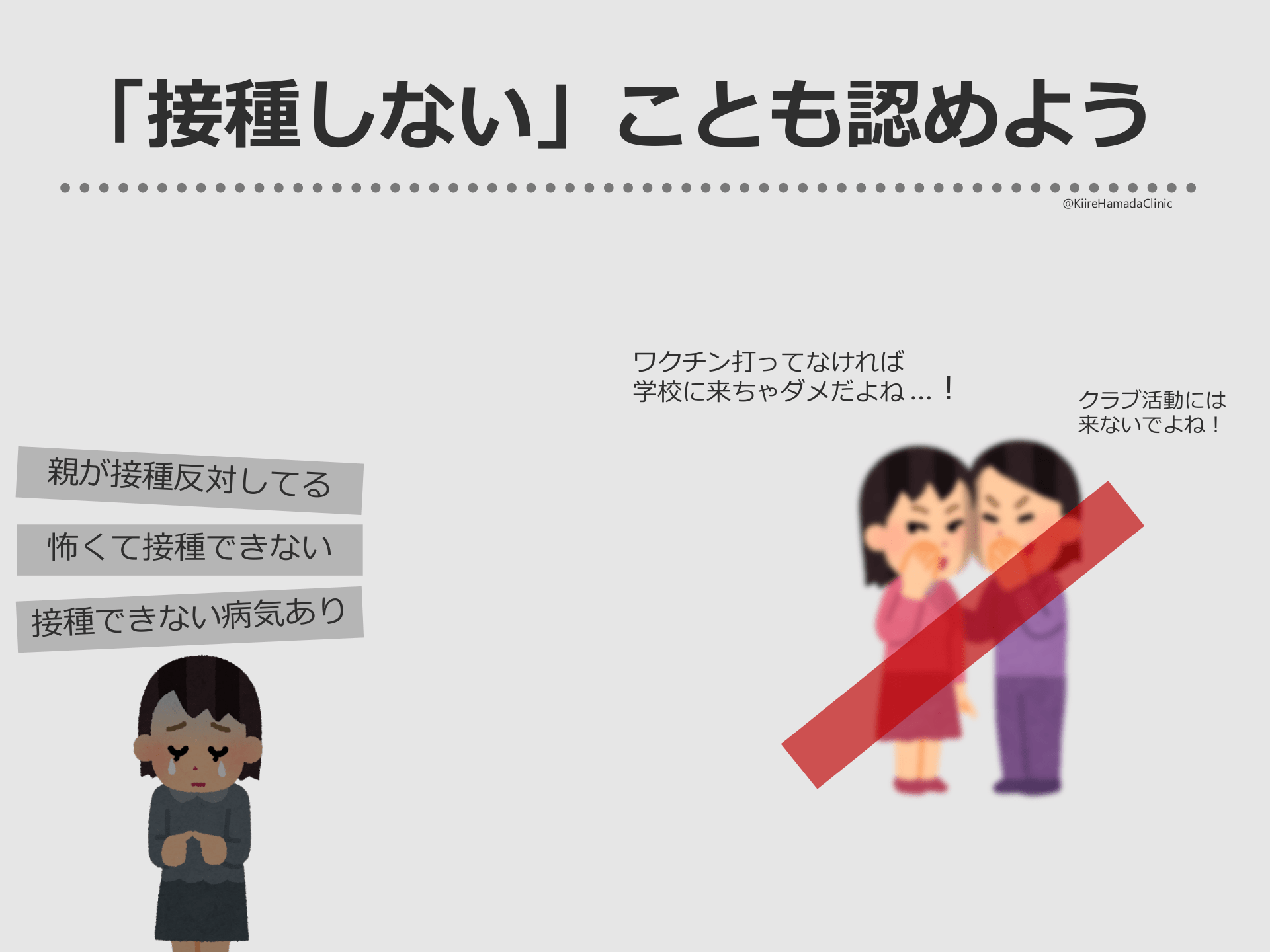 #29. 「接種しない」ことも認めよう @KiireHamadaClinic ワクチン打ってなければ 学校に来ちゃダメだよね …︕ 親が接種反対してる 怖くて接種できない 接種できない病気あり クラブ活動には 来ないでよね︕