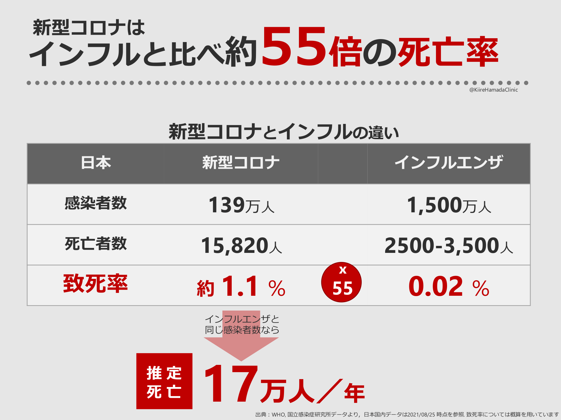 #7. 新型コロナは インフルと⽐べ約 55倍の死亡率 @KiireHamadaClinic 新型コロナとインフルの違い ⽇本 新型コロナ インフルエンザ 感染者数 139万⼈ 1,500万⼈ 死亡者数 15,820⼈ 2500-3,500⼈ 約 1.1 % 致死率 x 55 0.02 % インフルエンザと 同じ感染者数なら 推定 死亡 17万⼈/年 出典︓WHO, 国⽴感染症研究所データより,⽇本国内データは2021/08/25 時点を参照. 致死率については概算を⽤いています