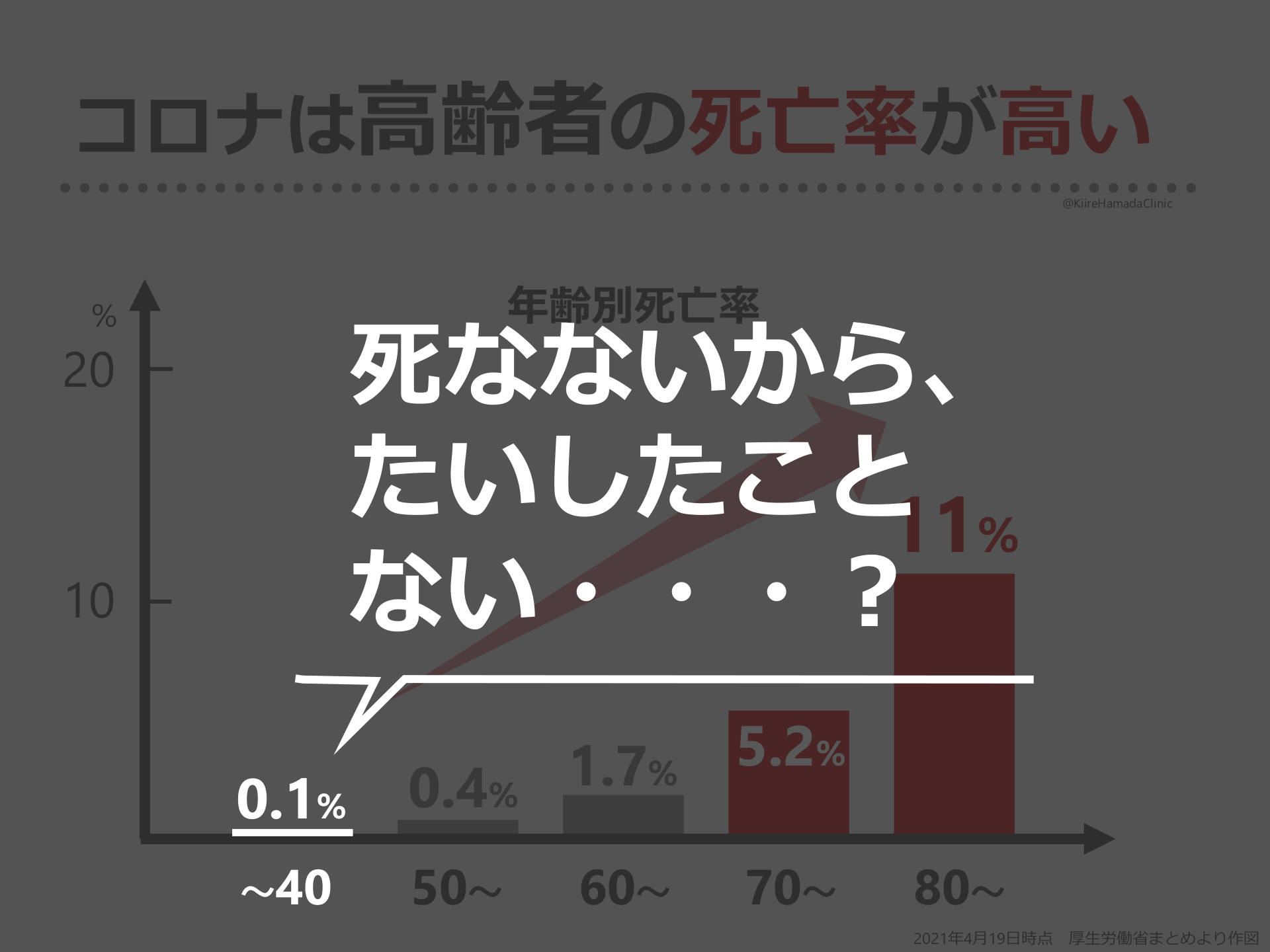 #9. コロナは⾼齢者の死亡率が⾼い @KiireHamadaClinic 年齢別死亡率 % 死なないから、 たいしたこと11% ない・・・︖ 20 10 0.1% 0.4% 1.7% 〜40 50〜 60〜 5.2% 70〜 80〜 2021年4⽉19⽇時点 厚⽣労働省まとめより作図