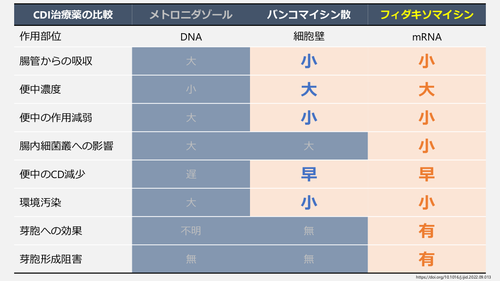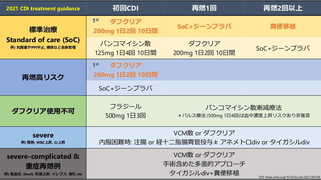 #9. 初回CDI 再燃1回 再燃2回以上 ダフクリア 200mg 1日2回 10日間 SoC+ジーンプラバ 糞便移植 バンコマイシン散 125mg 1日4回 10日間 ダフクリア 200mg 1日2回 10日間 SoC+ジーンプラバ 2021 CDI treatment guidance 1st 標準治療 Standard of care (SoC) 例) 抗菌薬やPPI中止, 補液など全身管理 1st 再燃高リスク ダフクリア 200mg 1日2回 10日間 SoC+ジーンプラバ ダフクリア使用不可 severe 例) 発熱, WBC上昇, Cr上昇 severe-complicated & 重症再燃例 例) 低血圧, shock, 乳酸上昇, イレウス, 穿孔 etc フラジール 500mg 1日3回 バンコマイシン散漸減療法 *パルス療法 (500mg 1日4回)は血中濃度上昇リスクあり非推奨 VCM散 or ダフクリア 内服困難時: 注腸 or 経十二指腸胃管投与± アネメトロdiv or タイガシルdiv VCM散 or ダフクリア 手術含めた多面的アプローチ タイガシルdiv+糞便移植 DOI: https://doi.org/10.1016/j.cmi.2021.09.038