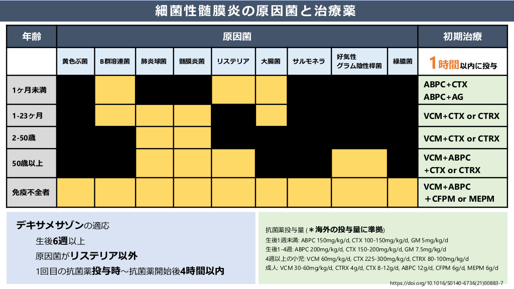 #11. 細菌性髄膜炎の原因菌と治療薬 年齢 原因菌 黄色ぶ菌 B群溶連菌 肺炎球菌 髄膜炎菌 リステリア 初期治療 大腸菌 サルモネラ 好気性 グラム陰性桿菌 緑膿菌 1時間以内に投与 1ヶ月未満 ABPC+CTX ABPC+AG 1-23ヶ月 VCM+CTX or CTRX 2-50歳 VCM+CTX or CTRX 50歳以上 VCM+ABPC +CTX or CTRX 免疫不全者 VCM+ABPC +CFPM or MEPM デキサメサゾンの適応 抗菌薬投与量 (*海外の投与量に準拠) 生後6週以上 生後1週未満: ABPC 150mg/kg/d, CTX 100-150mg/kg/d, GM 5mg/kg/d 原因菌がリステリア以外 4週以上の小児: VCM 60mg/kg/d, CTX 225-300mg/kg/d, CTRX 80-100mg/kg/d 1回目の抗菌薬投与時~抗菌薬開始後4時間以内 生後1-4週: ABPC 200mg/kg/d, CTX 150-200mg/kg/d, GM 7.5mg/kg/d 成人: VCM 30-60mg/kg/d, CTRX 4g/d, CTX 8-12g/d, ABPC 12g/d, CFPM 6g/d, MEPM 6g/d https://doi.org/10.1016/S0140-6736(21)00883-7
