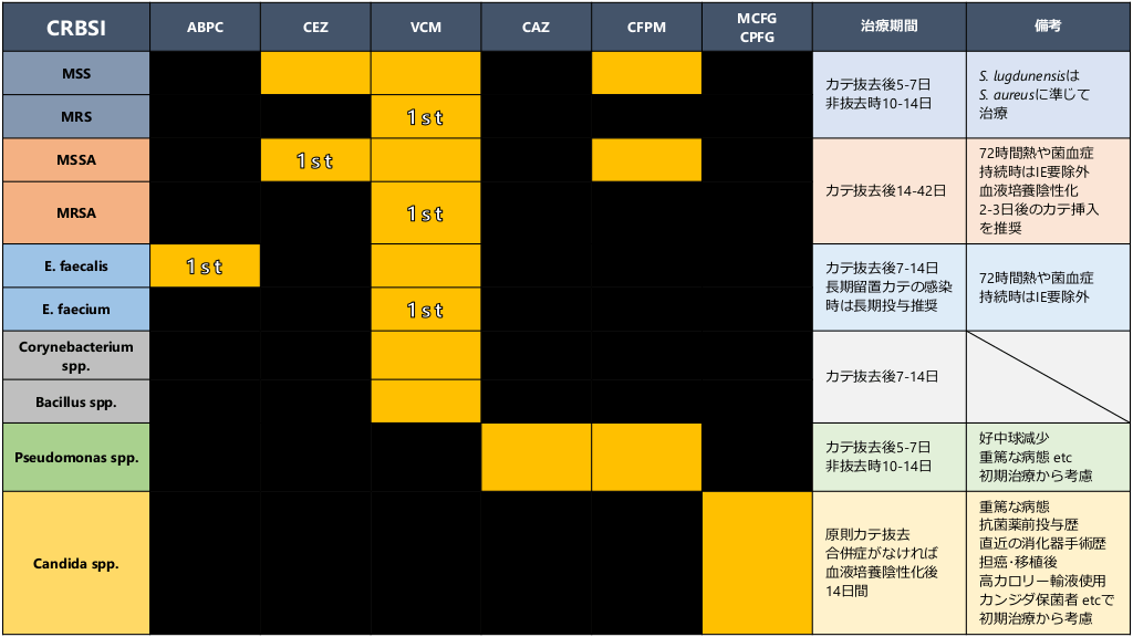 #12. CRBSI ABPC CEZ VCM MSS 1st MRS Corynebacterium spp. MCFG CPFG 治療期間 1st 1st 備考 カテ抜去後5-7日 非抜去時10-14日 S. lugdunensisは S. aureusに準じて 治療 カテ抜去後14-42日 72時間熱や菌血症 持続時はIE要除外 血液培養陰性化 2-3日後のカテ挿入 を推奨 カテ抜去後7-14日 長期留置カテの感染 時は長期投与推奨 72時間熱や菌血症 持続時はIE要除外 1st MRSA E. faecium CFPM 1st MSSA E. faecalis CAZ カテ抜去後7-14日 Bacillus spp. Pseudomonas spp. Candida spp. カテ抜去後5-7日 非抜去時10-14日 好中球減少 重篤な病態 etc 初期治療から考慮 原則カテ抜去 合併症がなければ 血液培養陰性化後 14日間 重篤な病態 抗菌薬前投与歴 直近の消化器手術歴 担癌・移植後 高カロリー輸液使用 カンジダ保菌者 etcで 初期治療から考慮