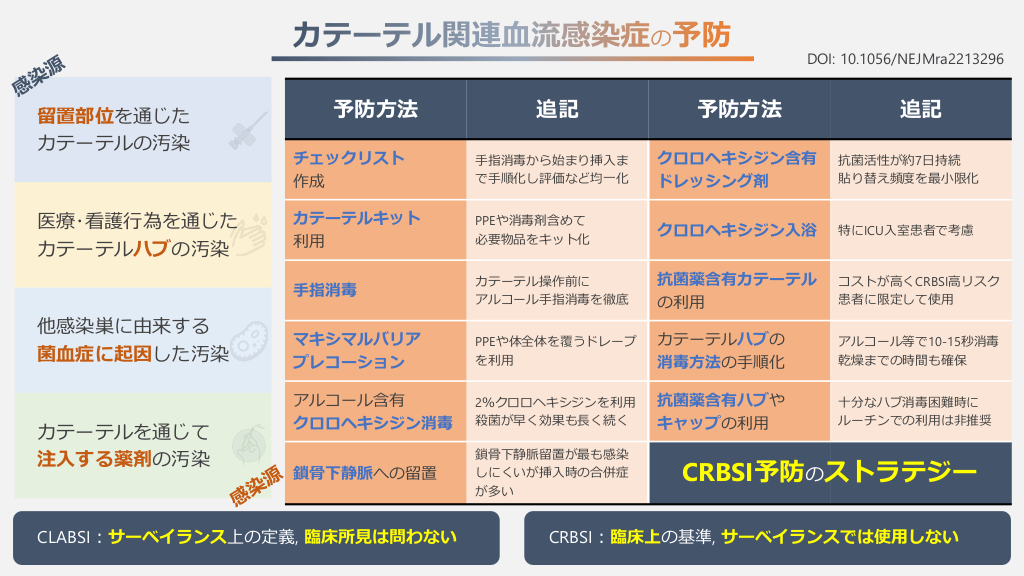 #13. カテーテル関連血流感染症の予防 留置部位を通じた カテーテルの汚染 医療・看護行為を通じた カテーテルハブの汚染 他感染巣に由来する 菌血症に起因した汚染 カテーテルを通じて 注入する薬剤の汚染 予防方法 追記 DOI: 10.1056/NEJMra2213296 予防方法 追記 チェックリスト 作成 手指消毒から始まり挿入ま で手順化し評価など均一化 クロロヘキシジン含有 ドレッシング剤 抗菌活性が約7日持続 貼り替え頻度を最小限化 カテーテルキット 利用 PPEや消毒剤含めて 必要物品をキット化 クロロヘキシジン入浴 特にICU入室患者で考慮 手指消毒 カテーテル操作前に アルコール手指消毒を徹底 抗菌薬含有カテーテル の利用 コストが高くCRBSI高リスク 患者に限定して使用 マキシマルバリア プレコーション PPEや体全体を覆うドレープ を利用 カテーテルハブの 消毒方法の手順化 アルコール等で10-15秒消毒 乾燥までの時間も確保 アルコール含有 クロロヘキシジン消毒 2%クロロヘキシジンを利用 殺菌が早く効果も長く続く 抗菌薬含有ハブや キャップの利用 十分なハブ消毒困難時に ルーチンでの利用は非推奨 鎖骨下静脈への留置 鎖骨下静脈留置が最も感染 しにくいが挿入時の合併症 が多い CLABSI:サーベイランス上の定義, 臨床所見は問わない CRBSI予防のストラテジー CRBSI:臨床上の基準, サーベイランスでは使用しない