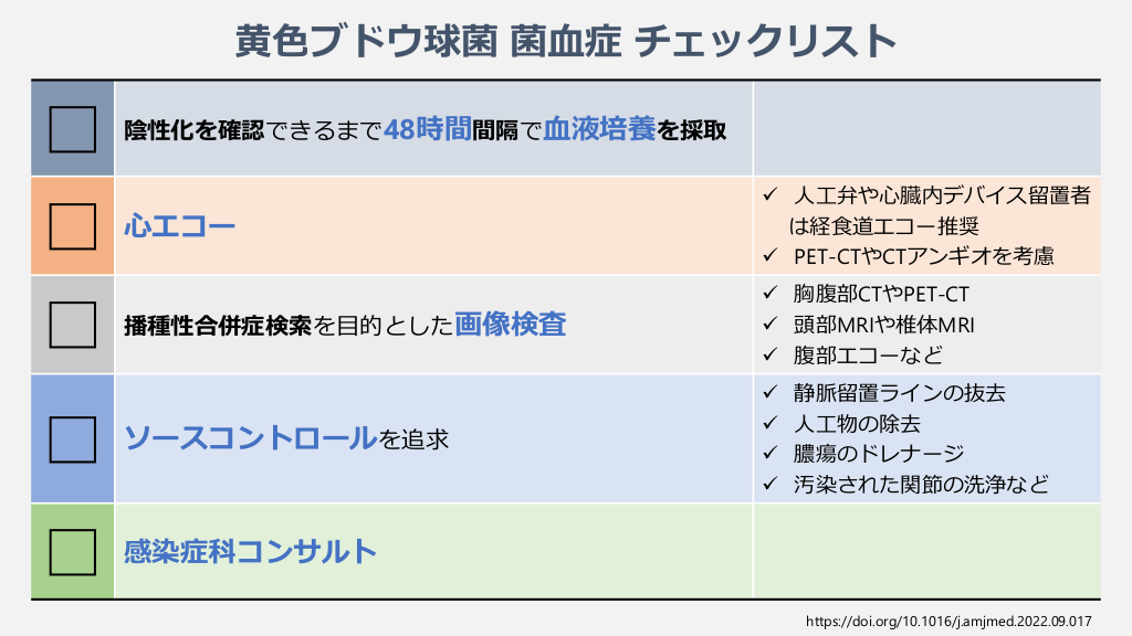 #14. 黄色ブドウ球菌 菌血症 チェックリスト □ 陰性化を確認できるまで48時間間隔で血液培養を採取 □ 心エコー ✓ 人工弁や心臓内デバイス留置者 は経食道エコー推奨 ✓ PET-CTやCTアンギオを考慮 □ ✓ 胸腹部CTやPET-CT ✓ 頭部MRIや椎体MRI ✓ 腹部エコーなど 播種性合併症検索を目的とした画像検査 □ ソースコントロール を追求 ✓ ✓ ✓ ✓ 静脈留置ラインの抜去 人工物の除去 膿瘍のドレナージ 汚染された関節の洗浄など □ 感染症科コンサルト https://doi.org/10.1016/j.amjmed.2022.09.017