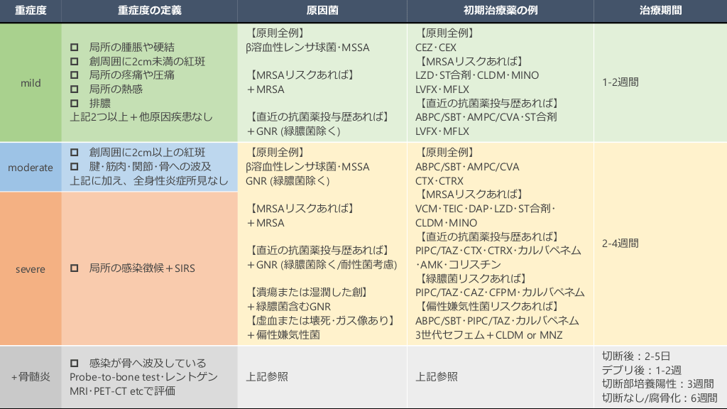 #15. 重症度 mild moderate 重症度の定義 局所の腫脹や硬結 創周囲に2cm未満の紅斑 局所の疼痛や圧痛 局所の熱感 排膿 上記2つ以上+他原因疾患なし 創周囲に2cm以上の紅斑 腱・筋肉・関節・骨への波及 上記に加え、全身性炎症所見なし 原因菌 【原則全例】 β溶血性レンサ球菌・MSSA 【MRSAリスクあれば】 +MRSA 【直近の抗菌薬投与歴あれば】 +GNR (緑膿菌除く) 【原則全例】 β溶血性レンサ球菌・MSSA GNR (緑膿菌除く) 【MRSAリスクあれば】 +MRSA severe 局所の感染徴候+SIRS 【直近の抗菌薬投与歴あれば】 +GNR (緑膿菌除く/耐性菌考慮) 【潰瘍または湿潤した創】 +緑膿菌含むGNR 【虚血または壊死・ガス像あり】 +偏性嫌気性菌 +骨髄炎 感染が骨へ波及している Probe-to-bone test・レントゲン MRI・PET-CT etcで評価 上記参照 初期治療薬の例 治療期間 【原則全例】 CEZ・CEX 【MRSAリスクあれば】 LZD・ST合剤・CLDM・MINO LVFX・MFLX 【直近の抗菌薬投与歴あれば】 ABPC/SBT・AMPC/CVA・ST合剤 LVFX・MFLX 1-2週間 【原則全例】 ABPC/SBT・AMPC/CVA CTX・CTRX 【MRSAリスクあれば】 VCM・TEIC・DAP・LZD・ST合剤・ CLDM・MINO 【直近の抗菌薬投与歴あれば】 PIPC/TAZ・CTX・CTRX・カルバペネム ・AMK・コリスチン 【緑膿菌リスクあれば】 PIPC/TAZ・CAZ・CFPM・カルバペネム 【偏性嫌気性菌リスクあれば】 ABPC/SBT・PIPC/TAZ・カルバペネム 3世代セフェム+CLDM or MNZ 2-4週間 上記参照 切断後:2-5日 デブリ後:1-2週 切断部培養陽性:3週間 切断なし/腐骨化:6週間