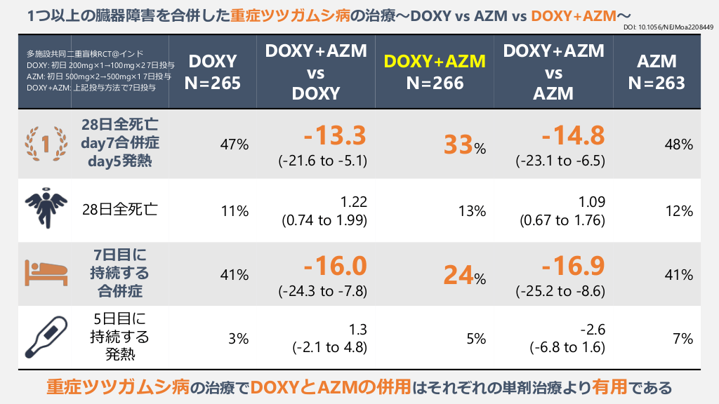 #16. 1つ以上の臓器障害を合併した重症ツツガムシ病の治療~DOXY vs AZM vs DOXY+AZM~ DOI: 10.1056/NEJMoa2208449 多施設共同二重盲検RCT@インド DOXY: 初日 200mg×1→100mg×2 7日投与 AZM: 初日 500mg×2→500mg×1 7日投与 DOXY+AZM: 上記投与方法で7日投与 DOXY N=265 28日全死亡 day7合併症 day5発熱 47% 28日全死亡 11% 7日目に 持続する 合併症 41% 5日目に 持続する 発熱 3% DOXY+AZM DOXY+AZM DOXY+AZM vs vs N=266 DOXY AZM -13.3 (-21.6 to -5.1) 1.22 (0.74 to 1.99) -16.0 (-24.3 to -7.8) 1.3 (-2.1 to 4.8) 33% 13% 24% 5% -14.8 (-23.1 to -6.5) 1.09 (0.67 to 1.76) -16.9 (-25.2 to -8.6) -2.6 (-6.8 to 1.6) AZM N=263 48% 12% 41% 7% 重症ツツガムシ病の治療でDOXYとAZMの併用はそれぞれの単剤治療より有用である
