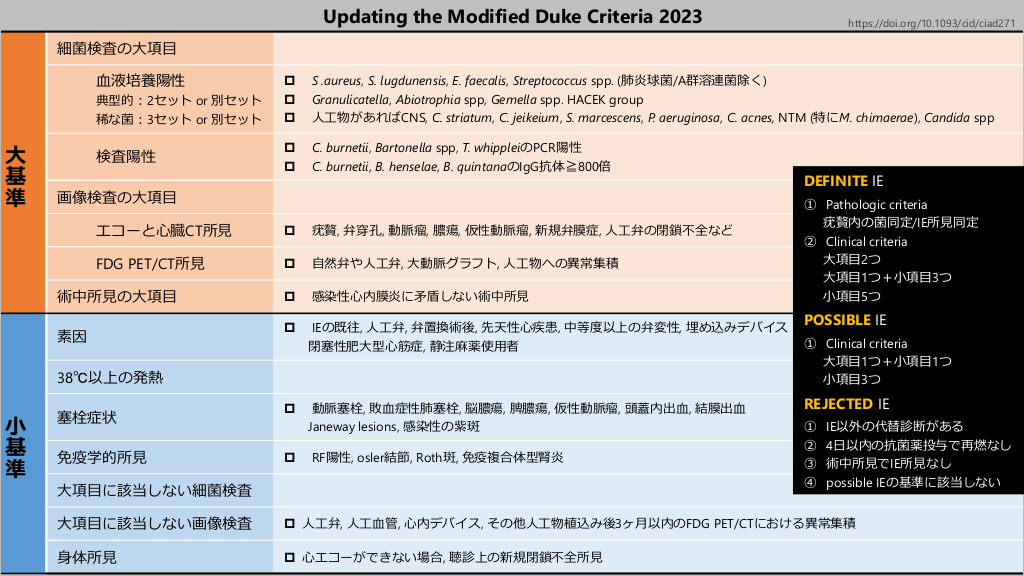 #17. Updating the Modified Duke Criteria 2023 https://doi.org/10.1093/cid/ciad271 細菌検査の大項目 血液培養陽性 典型的:2セット or 別セット 稀な菌:3セット or 別セット 大 基 準 検査陽性 S .aureus, S. lugdunensis, E. faecalis, Streptococcus spp. (肺炎球菌/A群溶連菌除く) Granulicatella, Abiotrophia spp, Gemella spp. HACEK group 人工物があればCNS, C. striatum, C. jeikeium, S. marcescens, P. aeruginosa, C. acnes, NTM (特にM. chimaerae), Candida spp C. burnetii, Bartonella spp, T. whippleiのPCR陽性 C. burnetii, B. henselae, B. quintanaのIgG抗体≧800倍 画像検査の大項目 エコーと心臓CT所見 疣贅, 弁穿孔, 動脈瘤, 膿瘍, 仮性動脈瘤, 新規弁膜症, 人工弁の閉鎖不全など FDG PET/CT所見 自然弁や人工弁, 大動脈グラフト, 人工物への異常集積 術中所見の大項目 感染性心内膜炎に矛盾しない術中所見 素因 IEの既往, 人工弁, 弁置換術後, 先天性心疾患, 中等度以上の弁変性, 埋め込みデバイス 閉塞性肥大型心筋症, 静注麻薬使用者 塞栓症状 動脈塞栓, 敗血症性肺塞栓, 脳膿瘍, 脾膿瘍, 仮性動脈瘤, 頭蓋内出血, 結膜出血 Janeway lesions, 感染性の紫斑 免疫学的所見 38℃以上の発熱 小 基 準 RF陽性, osler結節, Roth斑, 免疫複合体型腎炎 大項目に該当しない細菌検査 DEFINITE IE ① Pathologic criteria 疣贅内の菌同定/IE所見同定 ② Clinical criteria 大項目2つ 大項目1つ+小項目3つ 小項目5つ POSSIBLE IE ① Clinical criteria 大項目1