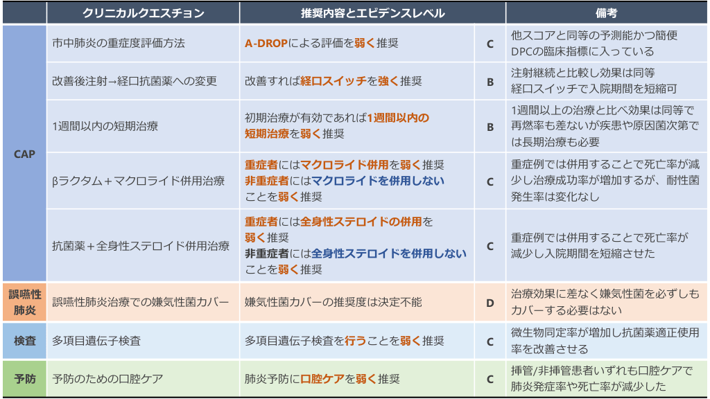 #2. クリニカルクエスチョン 推奨内容とエビデンスレベル 備考 市中肺炎の重症度評価方法 A-DROPによる評価を弱く推奨 C 他スコアと同等の予測能かつ簡便 DPCの臨床指標に入っている 改善後注射→経口抗菌薬への変更 改善すれば経口スイッチを強く推奨 B 注射継続と比較し効果は同等 経口スイッチで入院期間を短縮可 1週間以内の短期治療 初期治療が有効であれば1週間以内の 短期治療を弱く推奨 B 1週間以上の治療と比べ効果は同等で 再燃率も差ないが疾患や原因菌次第で は長期治療も必要 βラクタム+マクロライド併用治療 重症者にはマクロライド併用を弱く推奨 非重症者にはマクロライドを併用しない ことを弱く推奨 C 重症例では併用することで死亡率が減 少し治療成功率が増加するが、耐性菌 発生率は変化なし 抗菌薬+全身性ステロイド併用治療 重症者には全身性ステロイドの併用を 弱く推奨 非重症者には全身性ステロイドを併用しない ことを弱く推奨 C 重症例では併用することで死亡率が 減少し入院期間を短縮させた 嫌気性菌カバーの推奨度は決定不能 D 治療効果に差なく嫌気性菌を必ずしも カバーする必要はない CAP 誤嚥性 誤嚥性肺炎治療での嫌気性菌カバー 肺炎 検査 多項目遺伝子検査 多項目遺伝子検査を行うことを弱く推奨 C 微生物同定率が増加し抗菌薬適正使用 率を改善させる 予防 予防のための口腔ケア 肺炎予防に口腔ケアを弱く推奨 C 挿管/非挿管患者いずれも口腔ケアで 肺炎発症率や死亡率が減少した