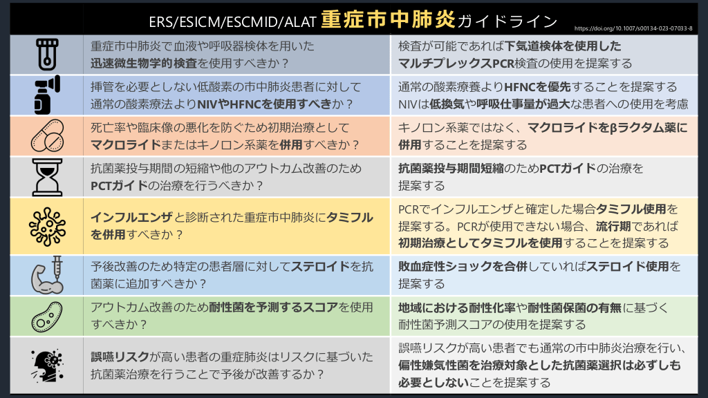 #3. ERS/ESICM/ESCMID/ALAT 重 症 市 中 肺 炎 ガ イ ド ラ イ ン https://doi.org/10.1007/s00134-023-07033-8 重症市中肺炎で血液や呼吸器検体を用いた 迅速微生物学的検査を使用すべきか? 検査が可能であれば下気道検体を使用した マルチプレックスPCR検査の使用を提案する 挿管を必要としない低酸素の市中肺炎患者に対して 通常の酸素療法よりNIVやHFNCを使用すべきか? 通常の酸素療養よりHFNCを優先することを提案する NIVは低換気や呼吸仕事量が過大な患者への使用を考慮 死亡率や臨床像の悪化を防ぐため初期治療として マクロライドまたはキノロン系薬を併用すべきか? キノロン系薬ではなく、マクロライドをβラクタム薬に 併用することを提案する 抗菌薬投与期間の短縮や他のアウトカム改善のため PCTガイドの治療を行うべきか? 抗菌薬投与期間短縮のためPCTガイドの治療を 提案する インフルエンザと診断された重症市中肺炎にタミフル を併用すべきか? PCRでインフルエンザと確定した場合タミフル使用を 提案する。PCRが使用できない場合、流行期であれば 初期治療としてタミフルを使用することを提案する 予後改善のため特定の患者層に対してステロイドを抗 菌薬に追加すべきか? 敗血症性ショックを合併していればステロイド使用を 提案する アウトカム改善のため耐性菌を予測するスコアを使用 すべきか? 地域における耐性化率や耐性菌保菌の有無に基づく 耐性菌予測スコアの使用を提案する 誤嚥リスクが高い患者の重症肺炎はリスクに基づいた 抗菌薬治療を行うことで予後が改善するか? 誤嚥リスクが高い患者でも通常の市中肺炎治療を行い、 偏性嫌気性菌を治療対象とした抗菌薬選択は必ずしも 必要としないことを提案する