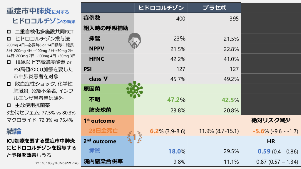 #4. 重症市中肺炎に対する ヒドロコルチゾンの効果 二重盲検化多施設共同RCT ヒドロコルチゾン投与法 200mg 4日→必要時8 or 14日投与に延長 8日: 200mg 4日→100mg 2日→50mg 2日 14日: 200mg 7日→100mg 4日→50mg 3日 18歳以上で高濃度酸素 or PSI高値のICU加療を要した 市中肺炎患者を対象 敗血症性ショック, 化学性 肺臓炎, 免疫不全者, インフ ルエンザ患者等は除外 主な使用抗菌薬 3世代セフェム: 77.5% vs 80.3% マクロライド: 72.3% vs 75.4% 結論 ヒドロコルチゾン 症例数 400 395 23% 21.5% NPPV 21.5% 22.8% HFNC 42.2% 41.0% 127 127 45.7% 49.2% 47.2% 42.5% 23.8% 20.8% 組入時の呼吸補助 挿管 PSI class Ⅴ 原因菌 不明 肺炎球菌 DOI: 10.1056/NEJMoa2215145 絶対リスク減少 1st outcome 28日全死亡 ICU加療を要する重症市中肺炎 にヒドロコルチゾンを投与する と予後を改善しうる プラセボ 6.2% (3.9-8.6) 11.9% (8.7-15.1) 2nd outcome 挿管 院内感染合併率 -5.6% (-9.6 - -1.7) HR 18.0% 29.5% 0.59 (0.4 - 0.86) 9.8% 11.1% 0.87 (0.57 – 1.34)