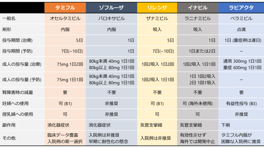#5. 一般名 剤形 タミフル ゾフルーザ リレンザ イナビル ラピアクタ オセルタミビル バロキサビル ザナミビル ラニナミビル ペラミビル 内服 内服 吸入 吸入 点滴 投与期間 (治療) 5日 1日 5日 1日 投与期間 (予防) 7日(~10日) 1日 7日(~10日) 1日または2日 成人の投与量 (治療) 75mg 1日2回 80kg未満 40mg 1日1回 80kg以上 80mg 1日1回 1回2吸入 1日2回 1回2吸入 1日1回 成人の投与量 (予防) 75mg 1日1回 80kg未満 40mg 1日1回 80kg以上 80mg 1日1回 1回2吸入 1日1回 1日 1回2吸入 2日 1回1吸入 要 不要 不要 不要 要 可 (B1) 非推奨 可 (B1) 可 (海外未使用) 有益性投与 (B3) 可 非推奨 可 可 非推奨 腎障害時の減量 妊婦への使用 授乳婦への使用 1日 (重症例は連日) - 通常 300mg 1日1回 重症 600mg 1日1回 - 副作用 消化器症状 消化器症状 気管支攣縮 気管支攣縮 下痢 その他 臨床データ豊富 入院例の第一選択 入院例は非推奨 早期に耐性化の懸念 入院例は非推奨 有効性示せず 海外では開発中止 タミフル内服が 困難な入院例に推奨