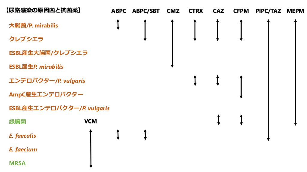 #6. 【尿路感染の原因菌と抗菌薬】 ABPC 大腸菌/P. mirabilis クレブシエラ ESBL産生大腸菌/クレブシエラ ESBL産生P. mirabilis エンテロバクター/P. vulgaris AmpC産生エンテロバクター ESBL産生エンテロバクター/P. vulgaris 緑膿菌 E. faecalis E. faecium MRSA VCM ABPC/SBT CMZ CTRX CAZ CFPM PIPC/TAZ MEPM