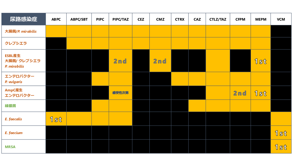 #7. 尿路感染症 ABPC ABPC/SBT PIPC PIPC/TAZ CEZ CMZ CTRX CAZ CTLZ/TAZ CFPM MEPM VCM 大腸菌/P. mirabilis クレブシエラ ESBL産生 大腸菌/ クレブシエラ P. mirabilis 2nd 1st 2nd エンテロバクター P. vulgaris AmpC産生 エンテロバクター 感受性次第 2nd 1st 緑膿菌 E. faecalis 1st E. faecium 1st MRSA 1st