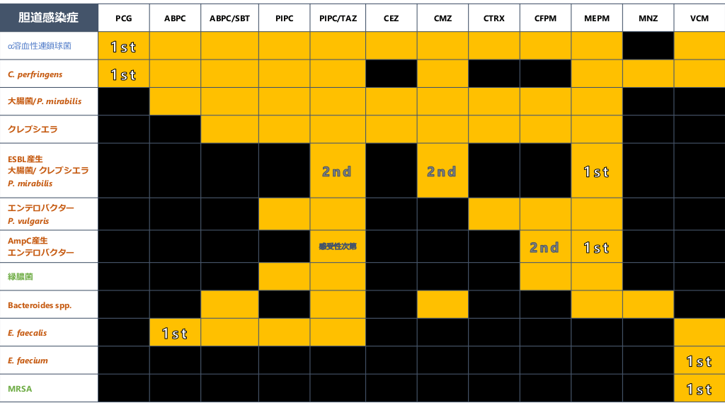 #8. 胆道感染症 PCG α溶血性連鎖球菌 1st C. perfringens 1st ABPC ABPC/SBT PIPC PIPC/TAZ CEZ CMZ CTRX CFPM MEPM MNZ VCM 大腸菌/P. mirabilis クレブシエラ ESBL産生 大腸菌/ クレブシエラ P. mirabilis 2nd 1st 2nd エンテロバクター P. vulgaris AmpC産生 エンテロバクター 感受性次第 2nd 1st 緑膿菌 Bacteroides spp. E. faecalis 1st E. faecium 1st MRSA 1st