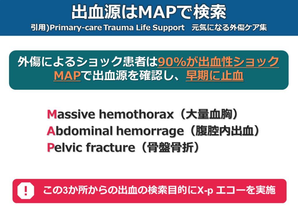 MAPで出血源を確認し、早期に止血 この3か所からの出血の検索目的にX-p エコーを実施 Massive hemothorax(大量血胸)