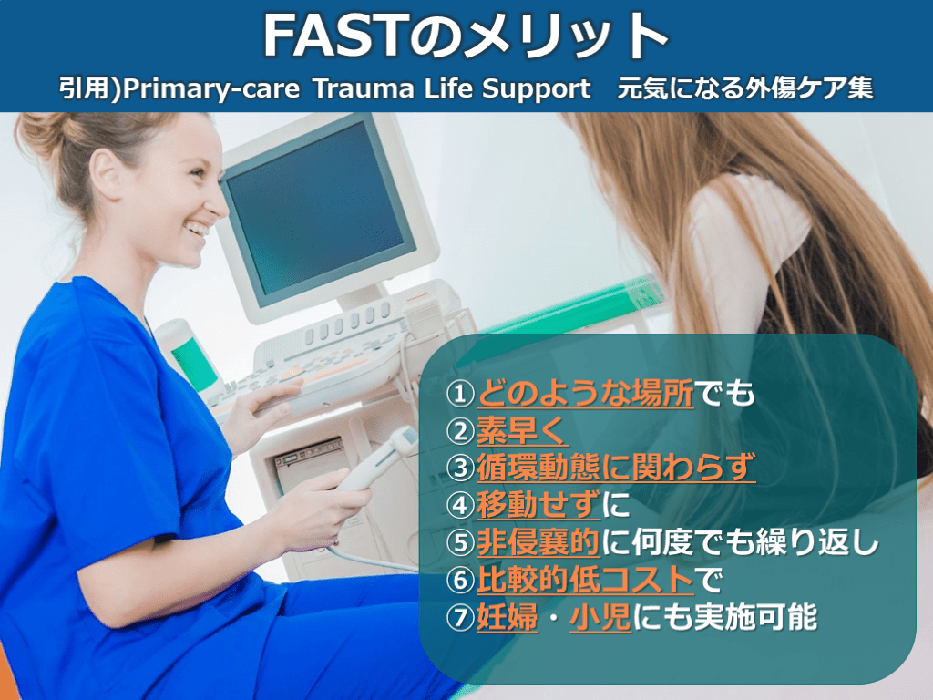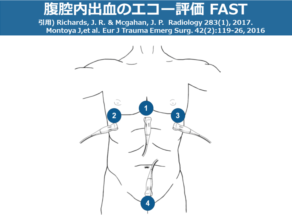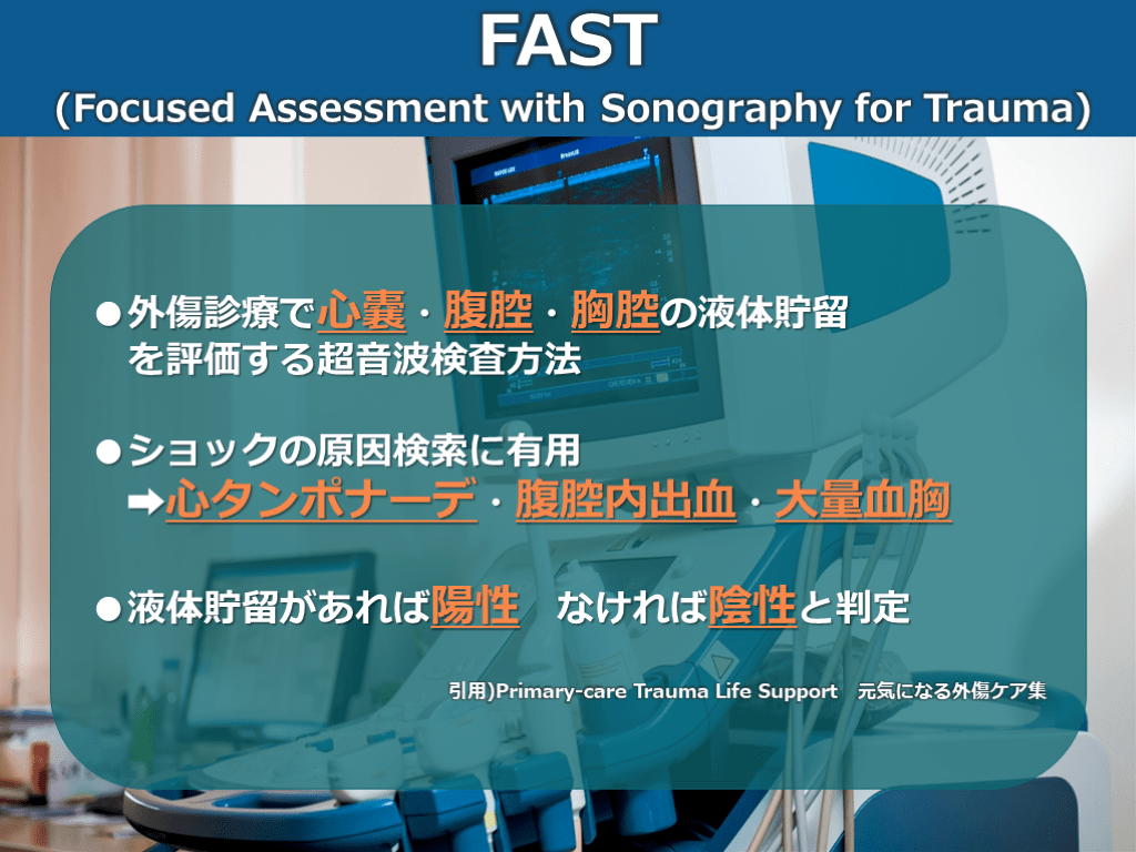 (Focused Assessment with Sonography for Trauma) ●外傷診療で心嚢・腹腔・胸腔の液体貯留