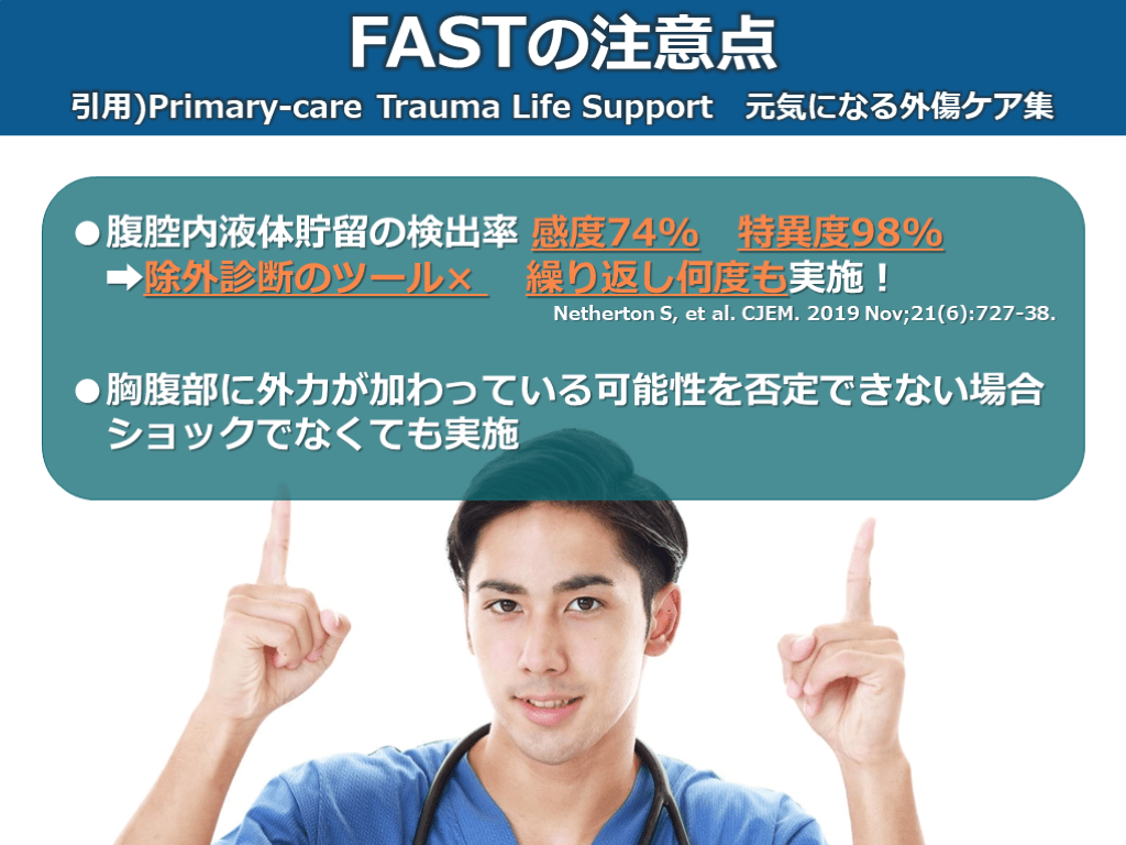引用)Primary-care Trauma Life Support 元気になる外傷ケア集 ●腹腔内液体貯留の検出率 感度74% 特異度98%