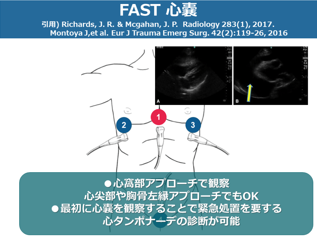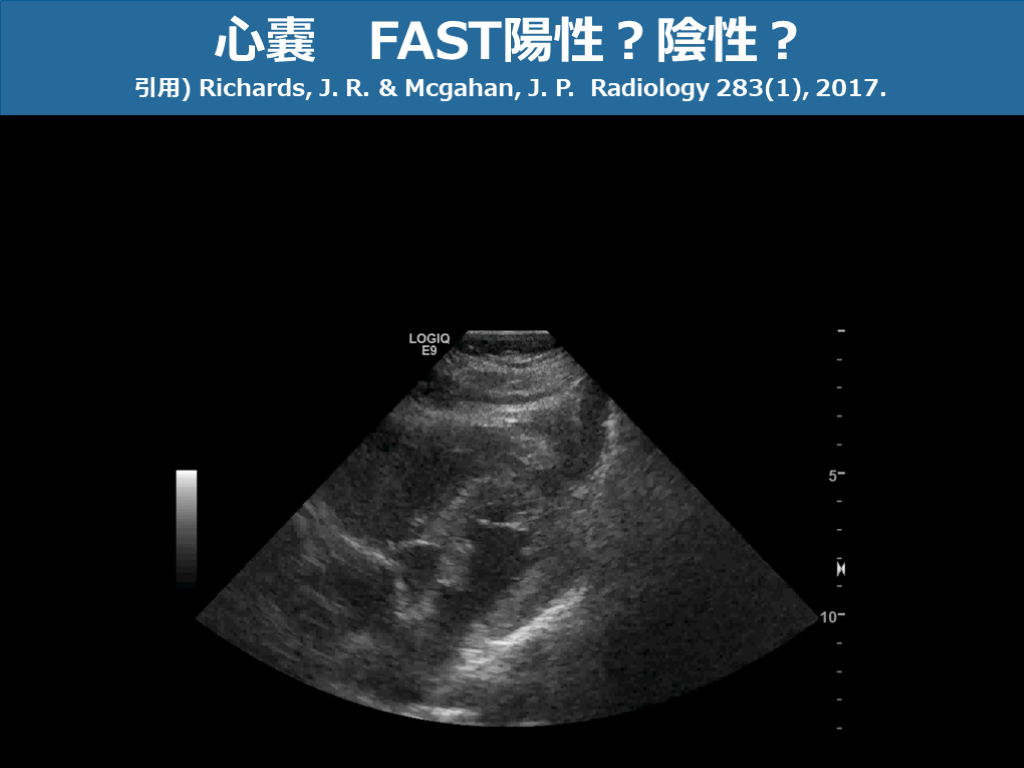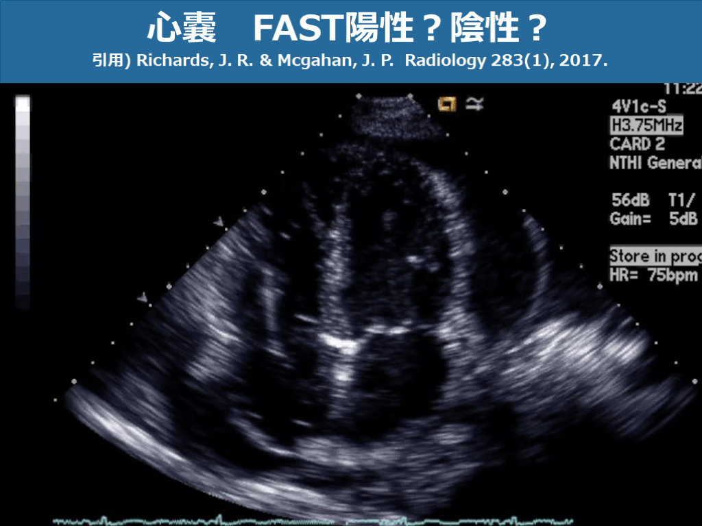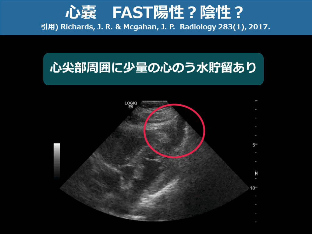 引用) Richards, J. R. & Mcgahan, J. P. Radiology 283(1), 2017. スライド画像)広島大学病院 演者作成 心尖部周囲に少量の心のう水貯留あり