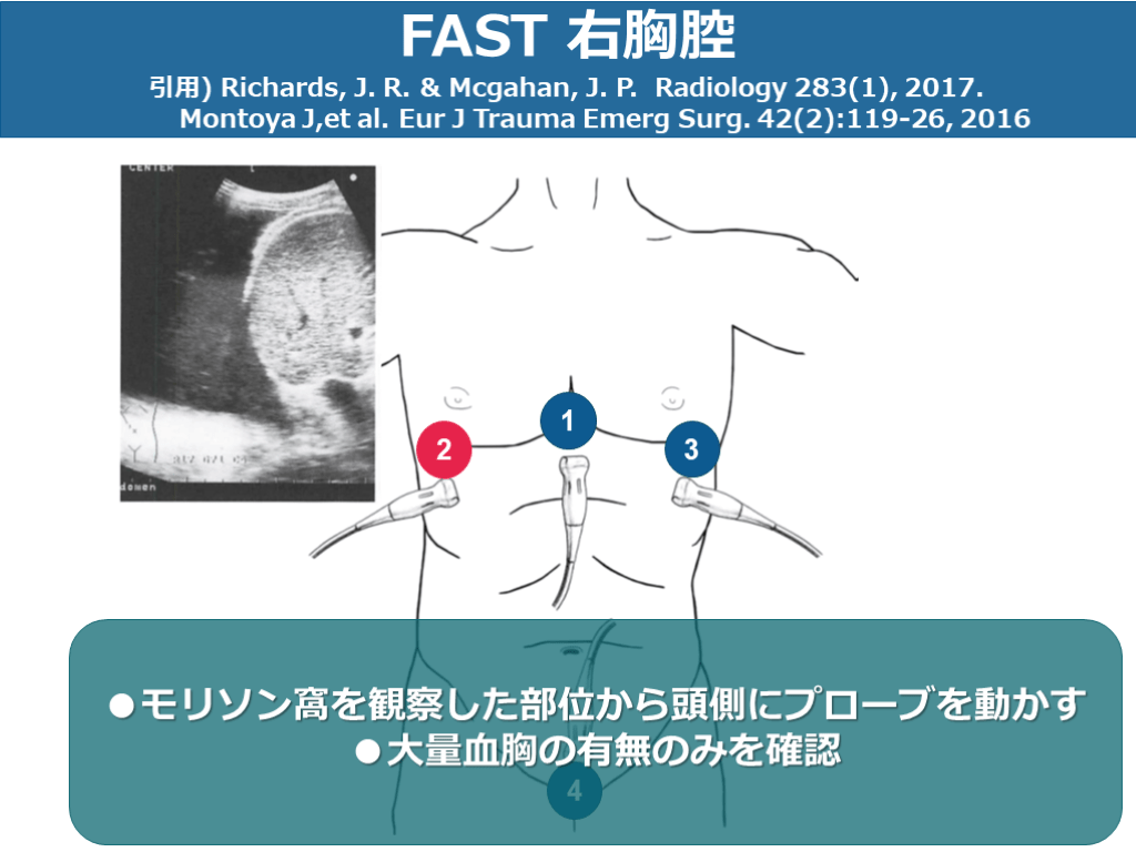 Montoya J,et al. Eur J Trauma Emerg Surg. 42(2):119-26, 2016 スライド画像)広島大学病院 演者作成 1 2 3 4 ●モリソン窩を観察した部位から頭側にプローブを動かす