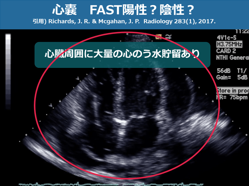 引用) Richards, J. R. & Mcgahan, J. P. Radiology 283(1), 2017. スライド画像)広島大学病院 演者作成 心臓周囲に大量の心のう水貯留あり