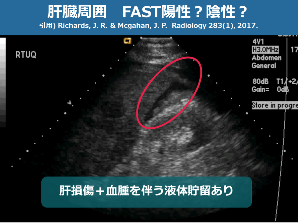 引用) Richards, J. R. & Mcgahan, J. P. Radiology 283(1), 2017. スライド画像)広島大学病院 演者作成 肝損傷+血腫を伴う液体貯留あり