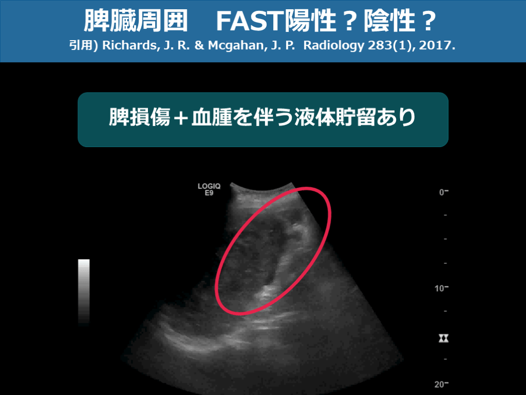 引用) Richards, J. R. & Mcgahan, J. P. Radiology 283(1), 2017. スライド画像)広島大学病院 演者作成 脾損傷+血腫を伴う液体貯留あり