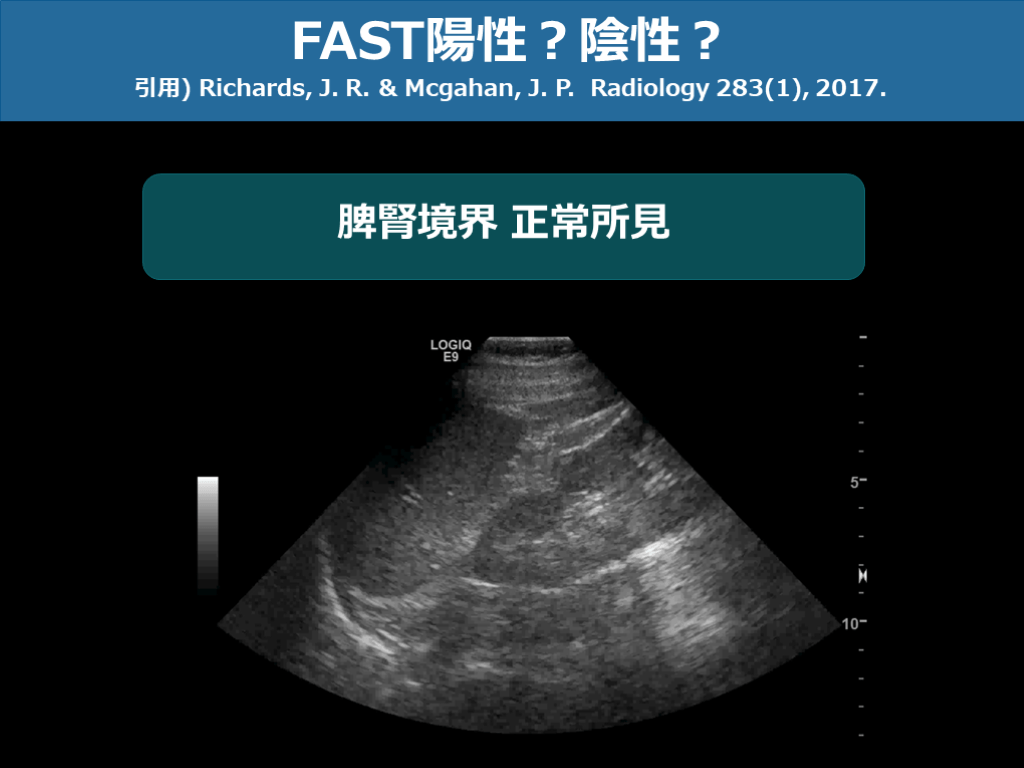 引用) Richards, J. R. & Mcgahan, J. P. Radiology 283(1), 2017. スライド画像)広島大学病院 演者作成 脾腎境界 正常所見