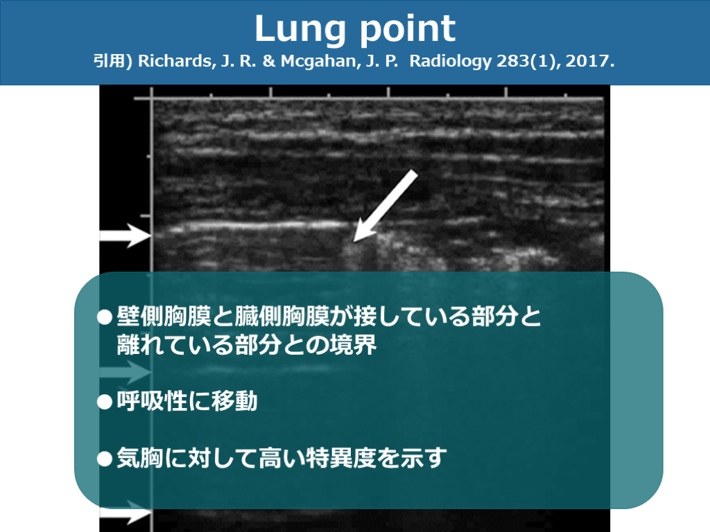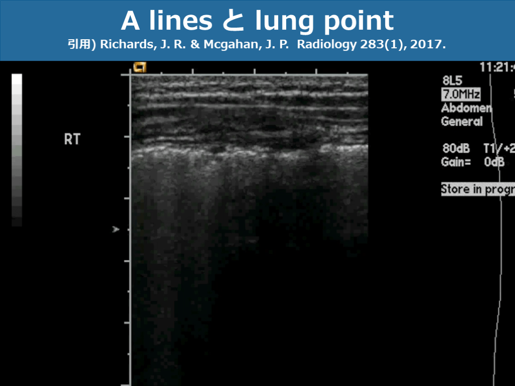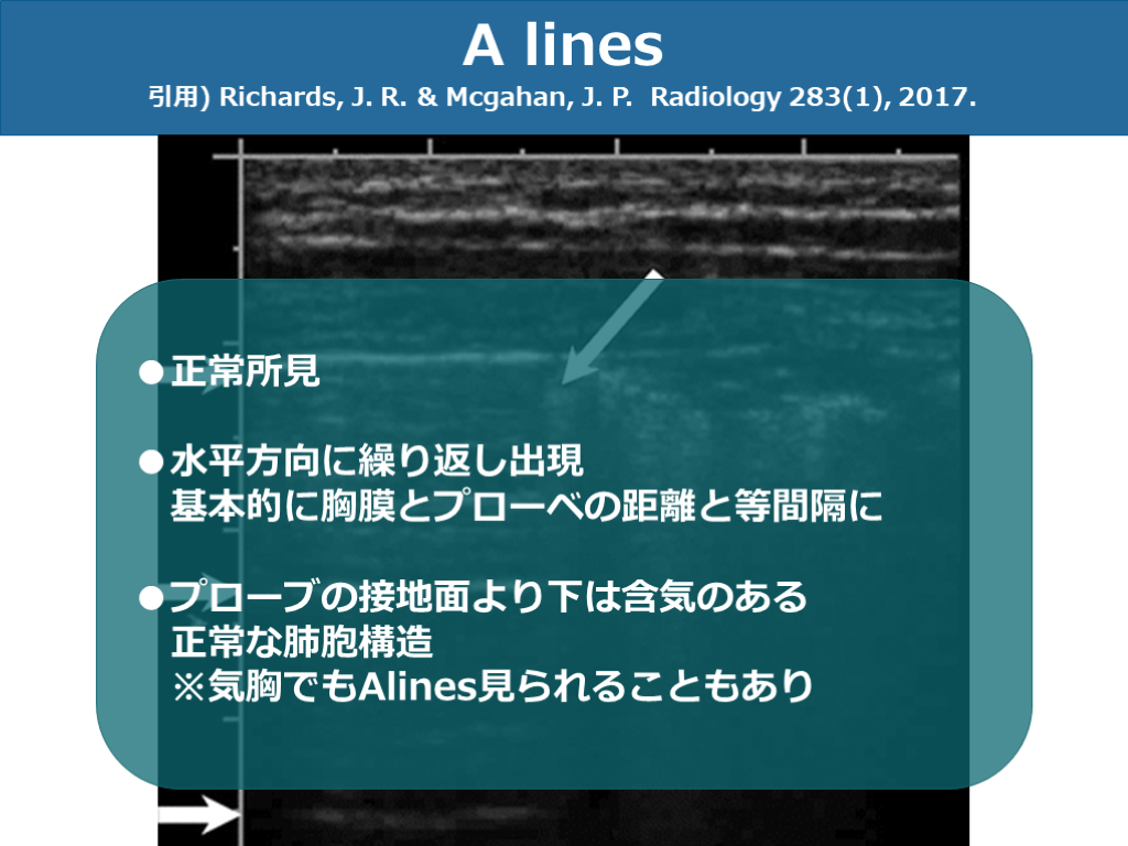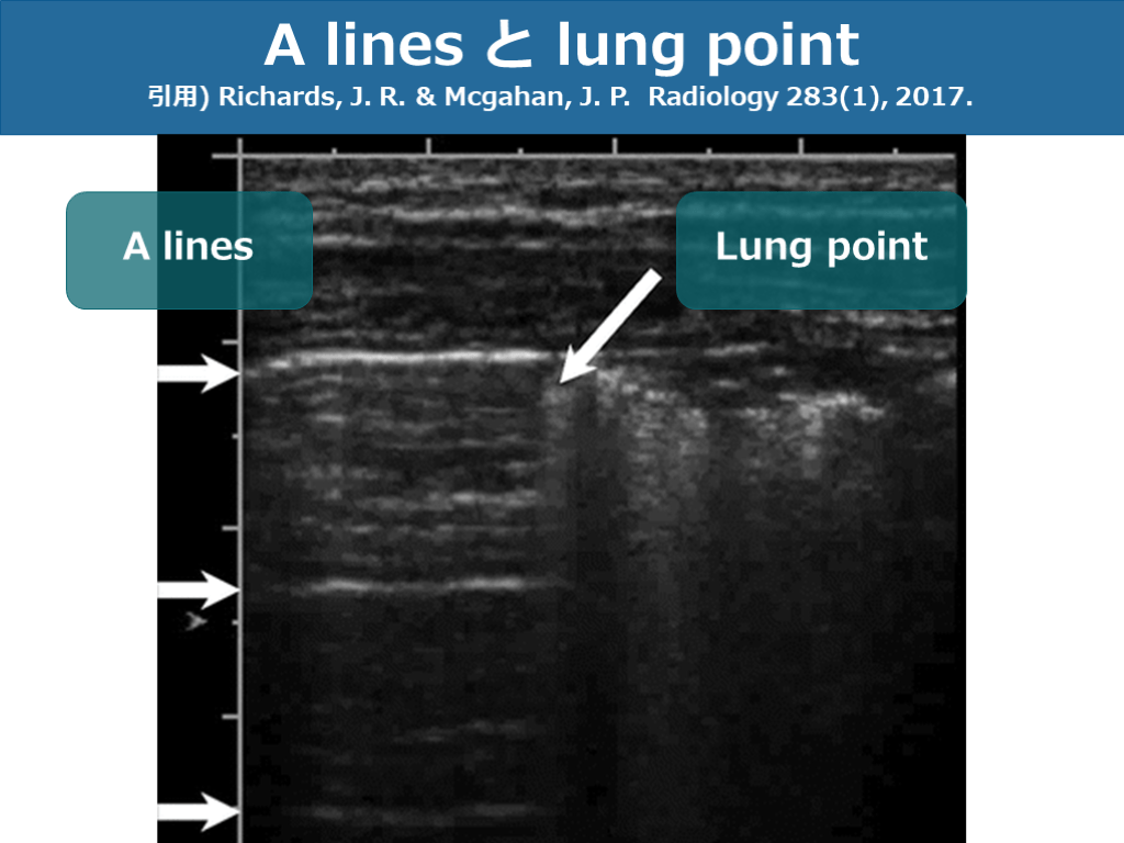 引用) Richards, J. R. & Mcgahan, J. P. Radiology 283(1), 2017. A lines Lung point