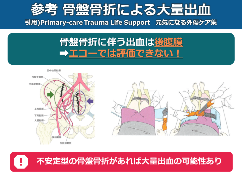 ➡エコーでは評価できない! 不安定型の骨盤骨折があれば大量出血の可能性あり