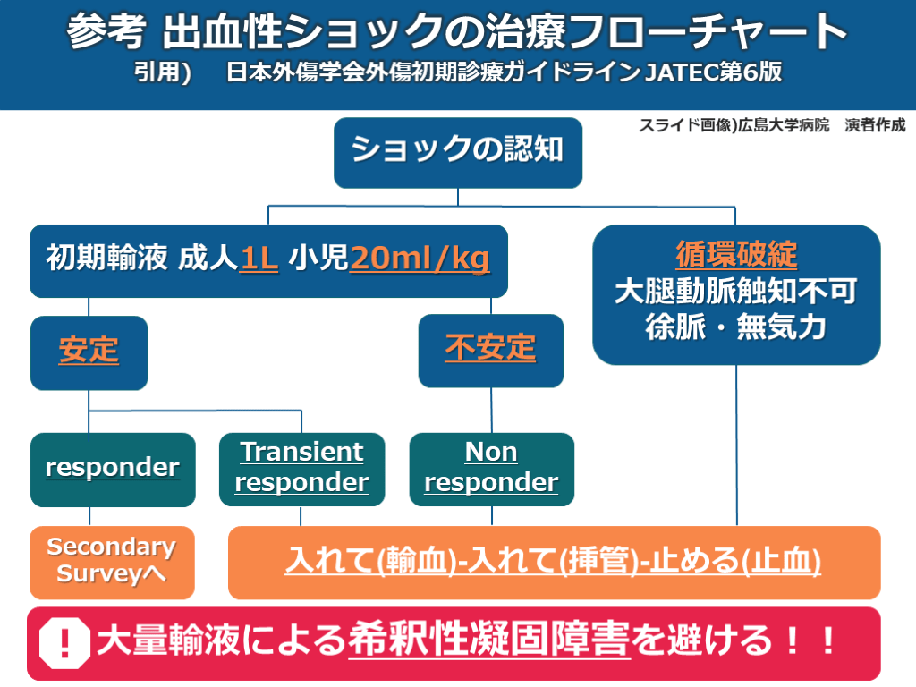引用) 日本外傷学会外傷初期診療ガイドライン JATEC第6版 ショックの認知 スライド画像)広島大学病院 演者作成 入れて(輸血)-入れて(挿管)-止める(止血) 初期輸液 成人1L 小児20ml/kg 循環破綻
