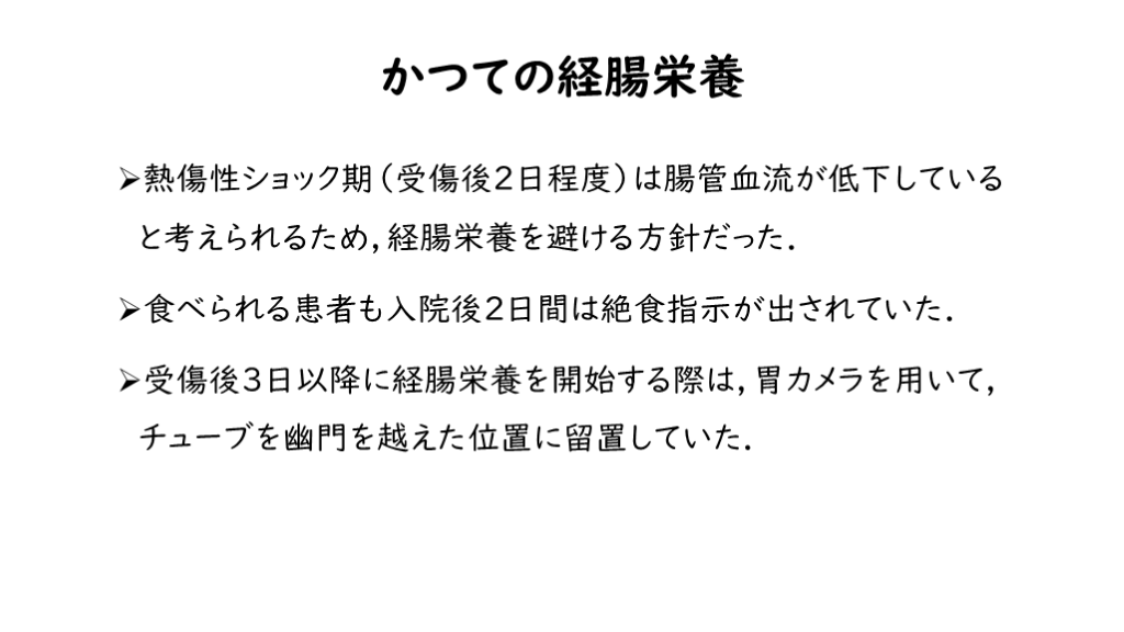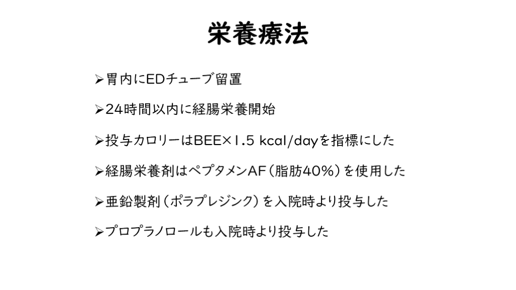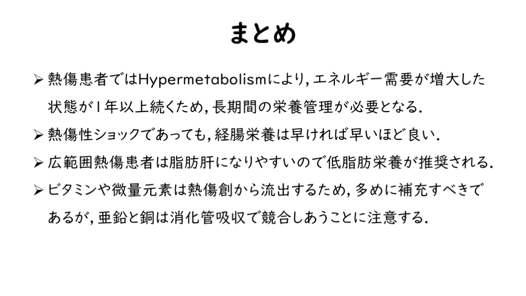 熱傷患者は、エネルギー需要が著しく増大し、1年以上続くHypermetabolism状態にあるため、長期間の栄養管理が不可欠です。特に、熱傷発生から24時間以内に経腸栄養を開始し、低脂肪栄養を推奨することが重要です。また、ビタミンや微量元素の補充も必要ですが、亜鉛と銅の吸収競合に注意が必要です。このスライドでは、熱傷患者に対する栄養療法の実際や症例紹介を通じて、医療関係者の理解を深めることを目指しています。