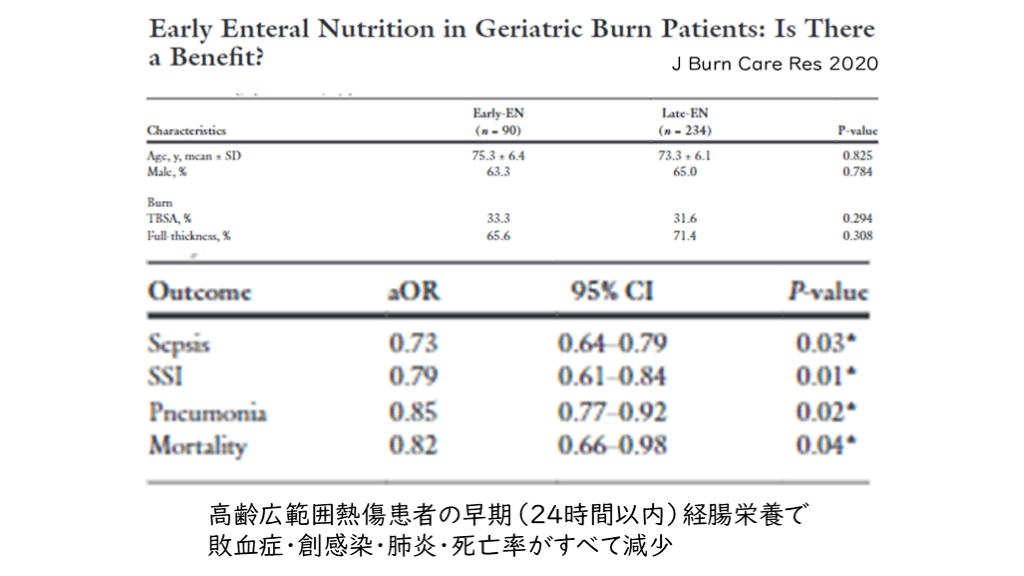 Castanon, L., Asmar, S., Bible, L., Chehab, M., Ditillo, M., Khurrum, M., Hanna, K., Douglas, M., & Joseph, B. (2020). Early enteral nutrition in geriatric burn patients: Is there a benefit? Journal of Burn Care and Research, 41(5), 986–991. https://doi.org/10.1093/jbcr/iraa109