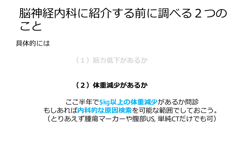 #10. 脳神経内科に紹介する前に調べる2つの こと 具体的には (1)筋力低下があるか (2)体重減少があるか ここ半年で5㎏以上の体重減少があるか問診 もしあれば内科的な原因検索を可能な範囲でしておこう。 (とりあえず腫瘍マーカーや腹部US, 単純CTだけでも可)