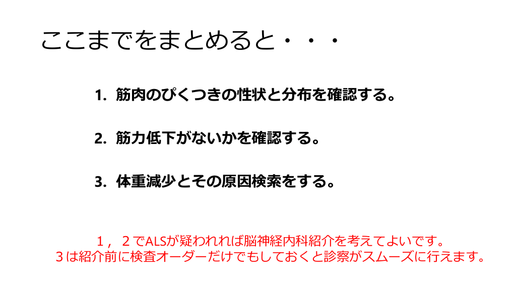 #11. ここまでをまとめると・・・ 1. 筋肉のぴくつきの性状と分布を確認する。 2. 筋力低下がないかを確認する。 3. 体重減少とその原因検索をする。 1,2でALSが疑われれば脳神経内科紹介を考えてよいです。 3は紹介前に検査オーダーだけでもしておくと診察がスムーズに行えます。
