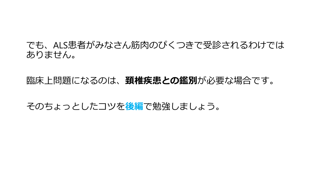 #12. でも、ALS患者がみなさん筋肉のぴくつきで受診されるわけでは ありません。 臨床上問題になるのは、頚椎疾患との鑑別が必要な場合です。 そのちょっとしたコツを後編で勉強しましょう。